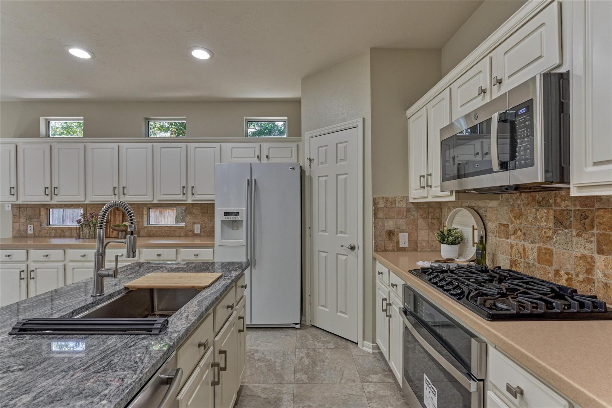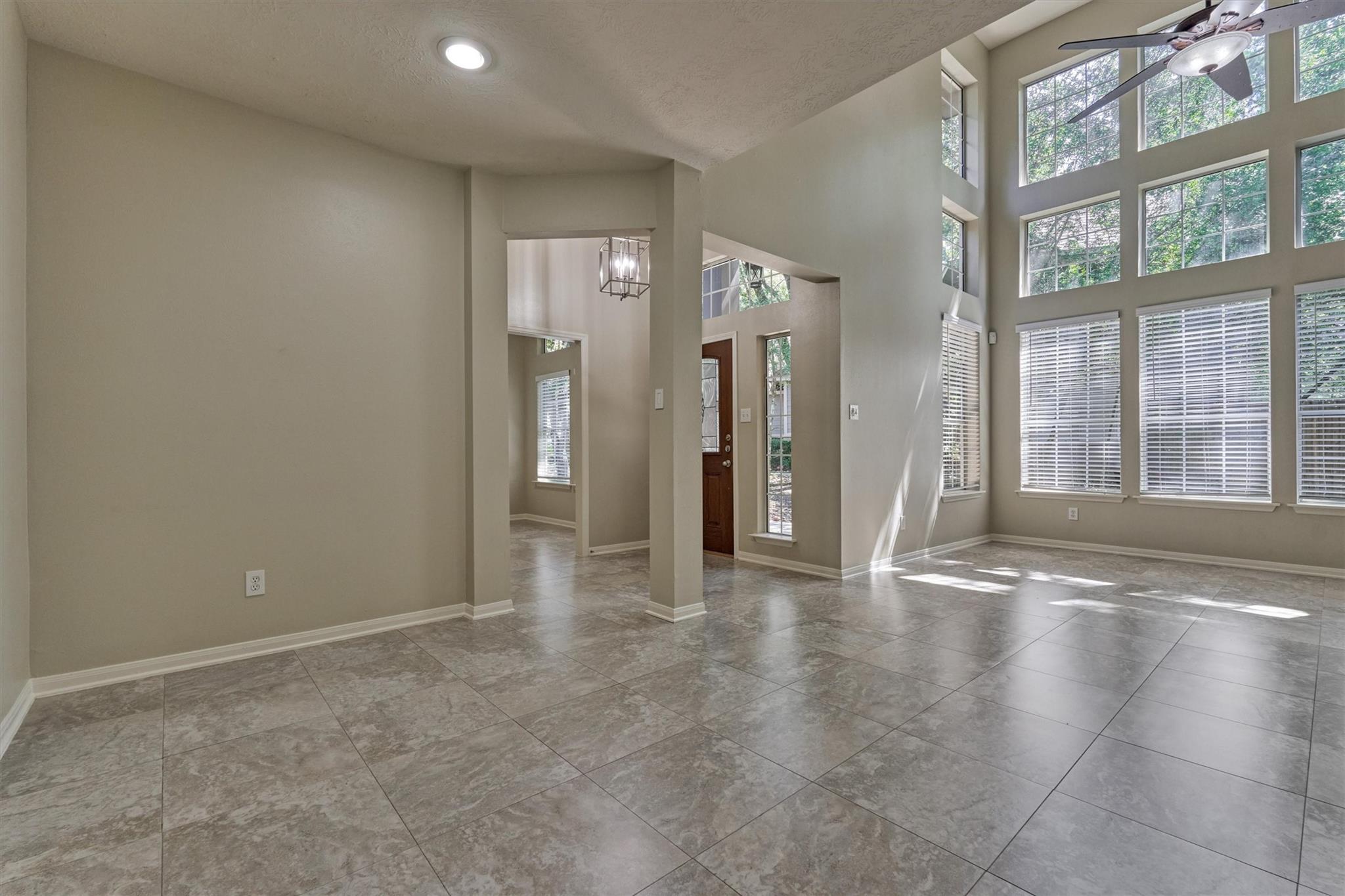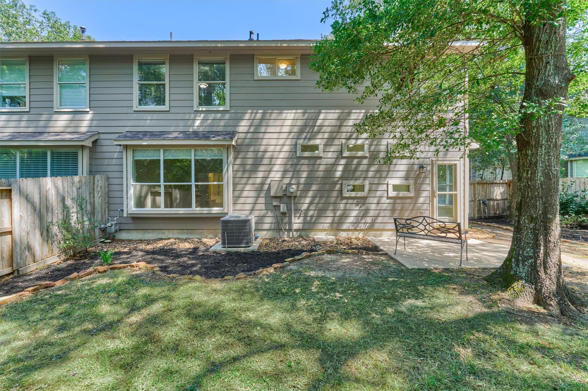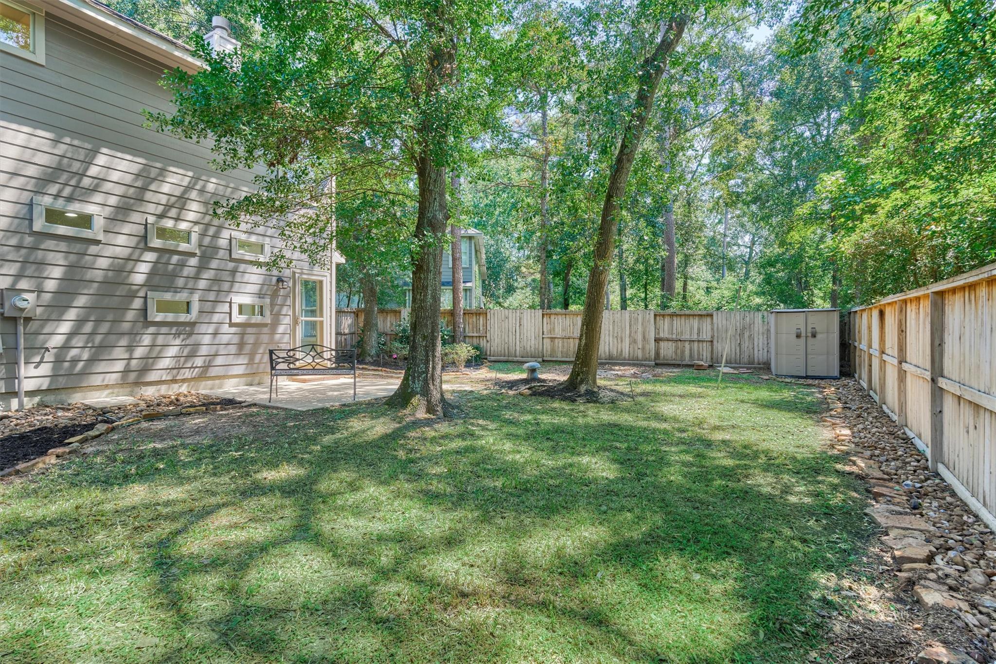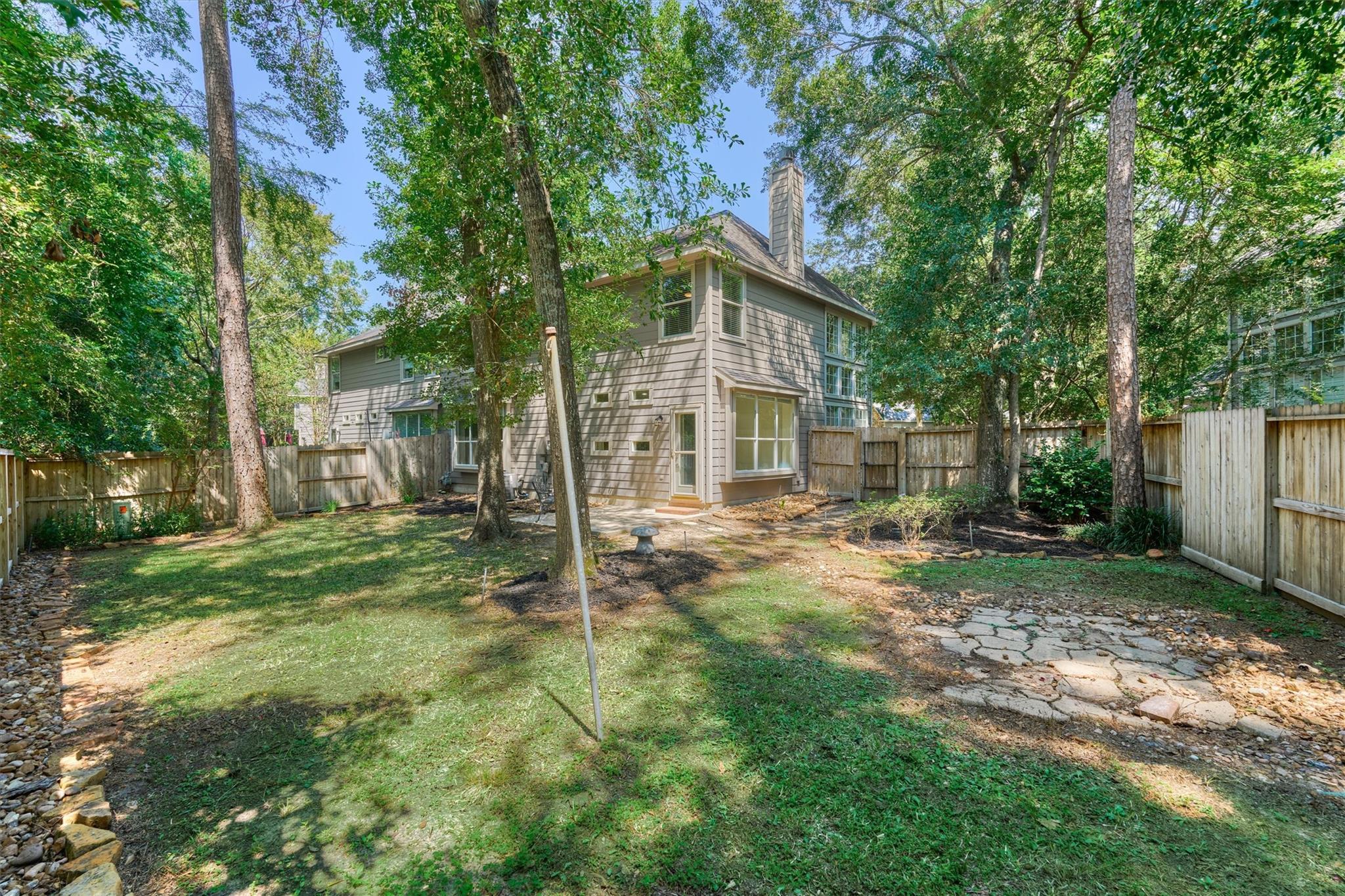 Prime Woodlands LOCATION, light, bright, and move-in ready! Lives like a SINGLE FAMILY! This beautifully updated home offers soaring ceilings, stunning two-story windows in the family living space with fireplace, and a private fenced backyard with NO REAR NEIGHBORS. 1ST FLOOR PRIMARY BEDROOM w/direct utility room access. The spacious kitchen is the heart of the home, featuring a granite island, NEWER Kohler PRO sink & faucet, UPDATED GAS COOKTOP, OVEN & MICROWAVE & included refrigerator. Formal dining + a private study or 4th bedroom option, provide flexibility for today's lifestyle. Upstairs you'll find a large GAMEROOM, w/additional FLEX SPACE, STORAGE! Recent 2025 updates include NEW H20 Heater, granite counters in the primary bath, updated lighting, refreshed half bath with granite vanity, garage door opener, disposal. HOA maintains the front lawn. Zoned to sought-after WOODLANDS HIGH SCHOOL, with a low tax rate. Near I-45, Hwy 242, EXXONMOBIL, shopping, hospitals, Hughes Landing.
