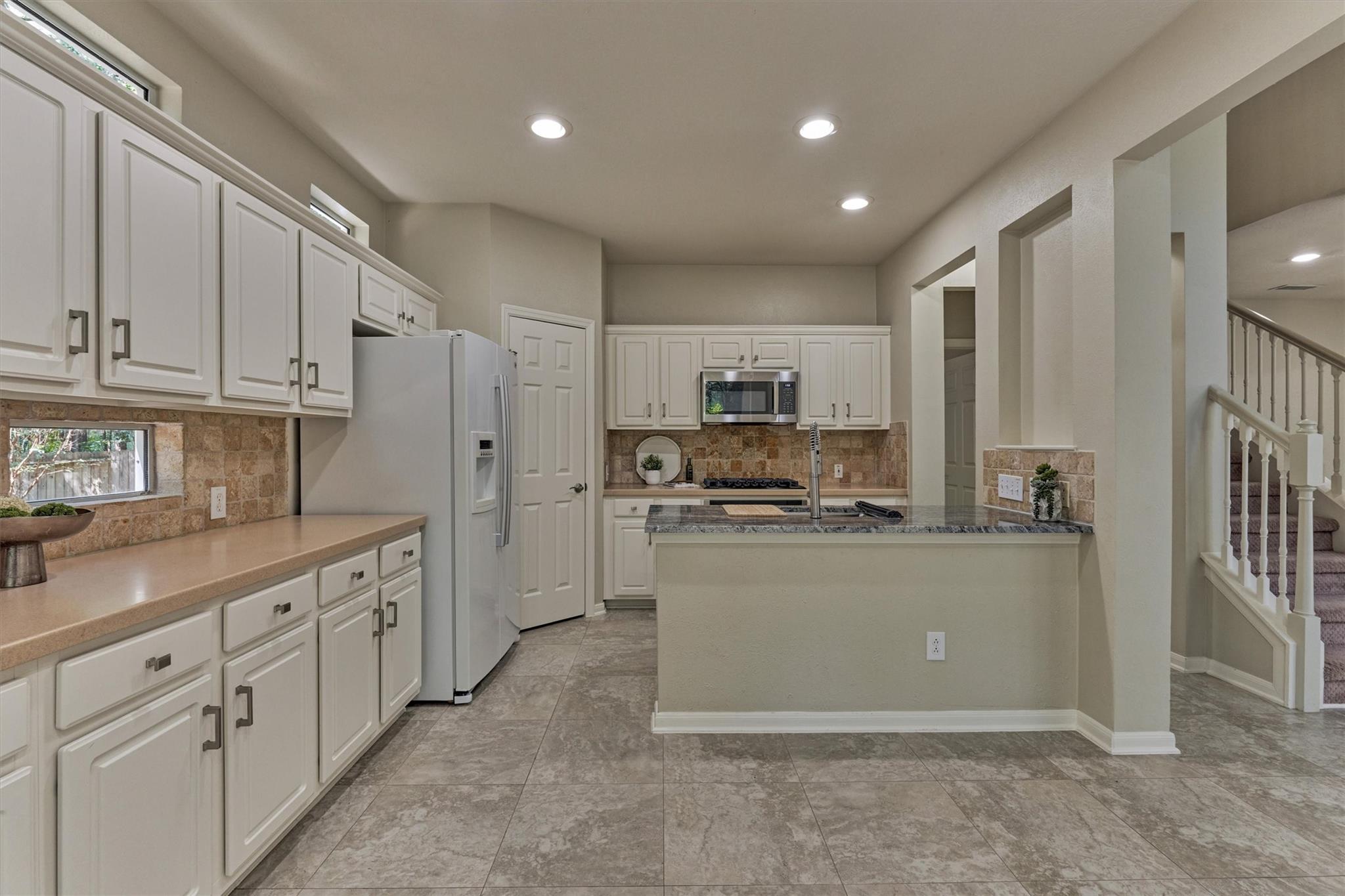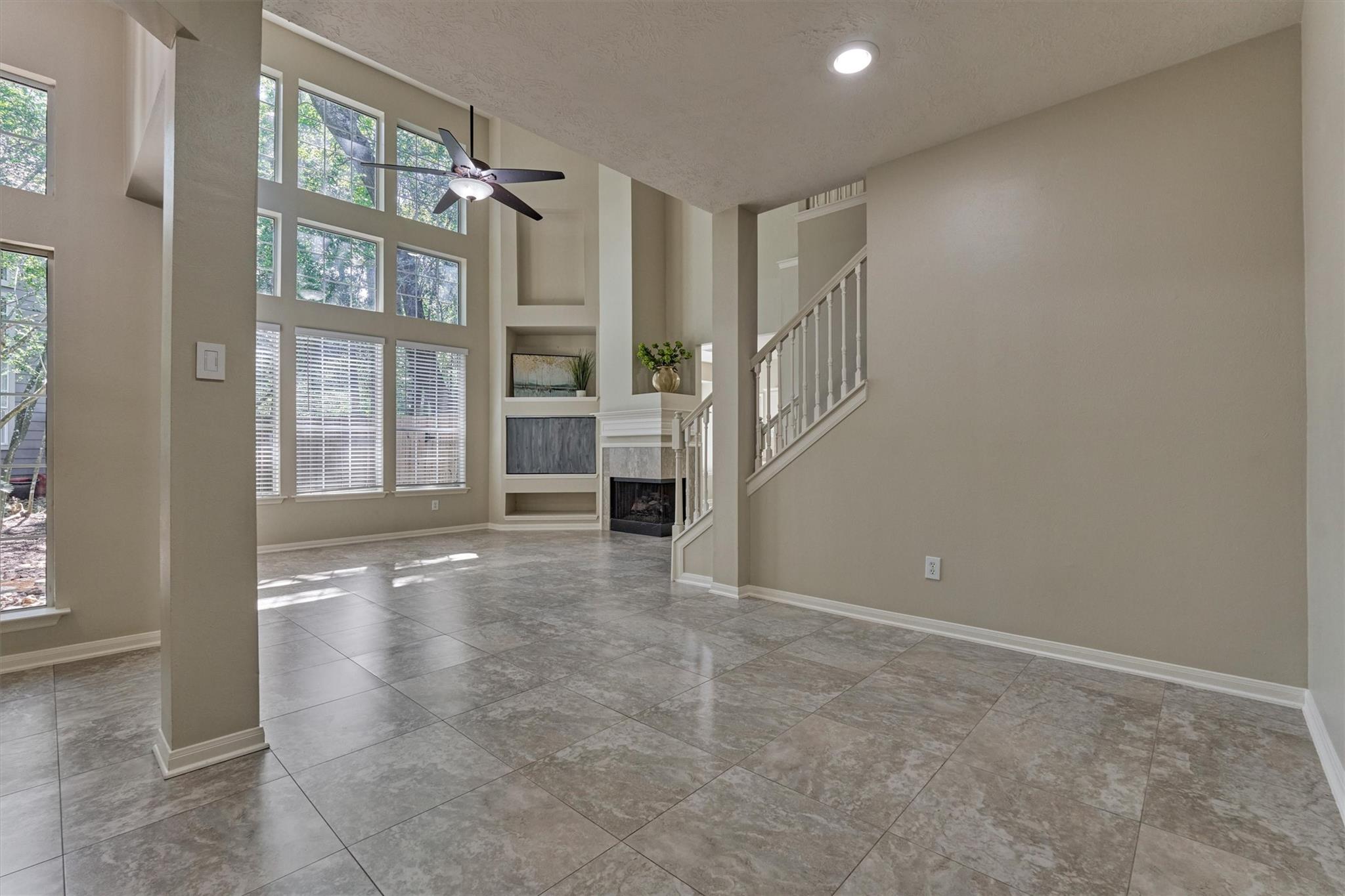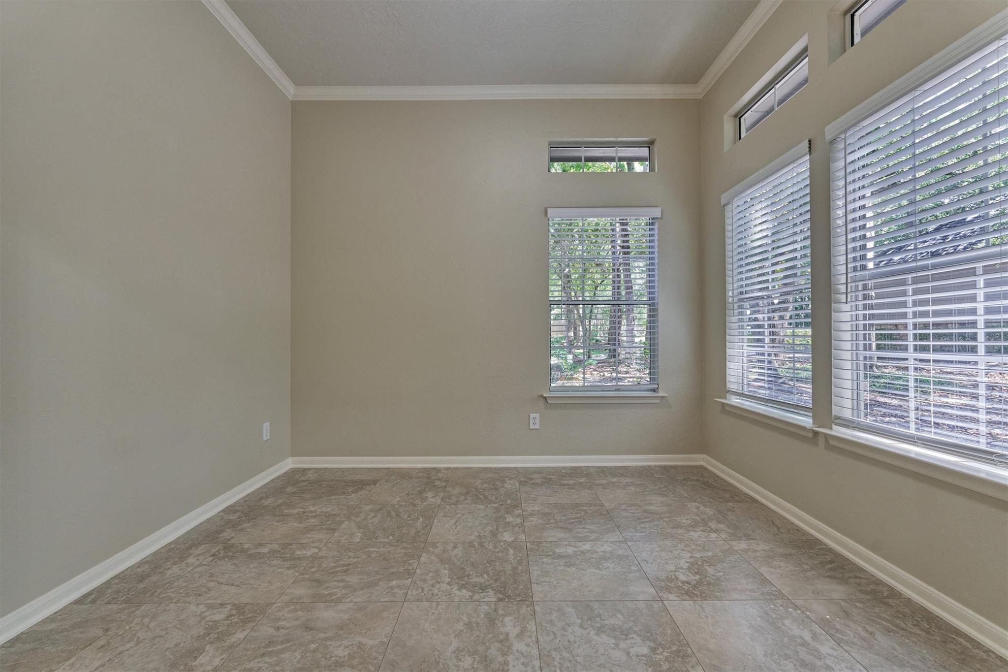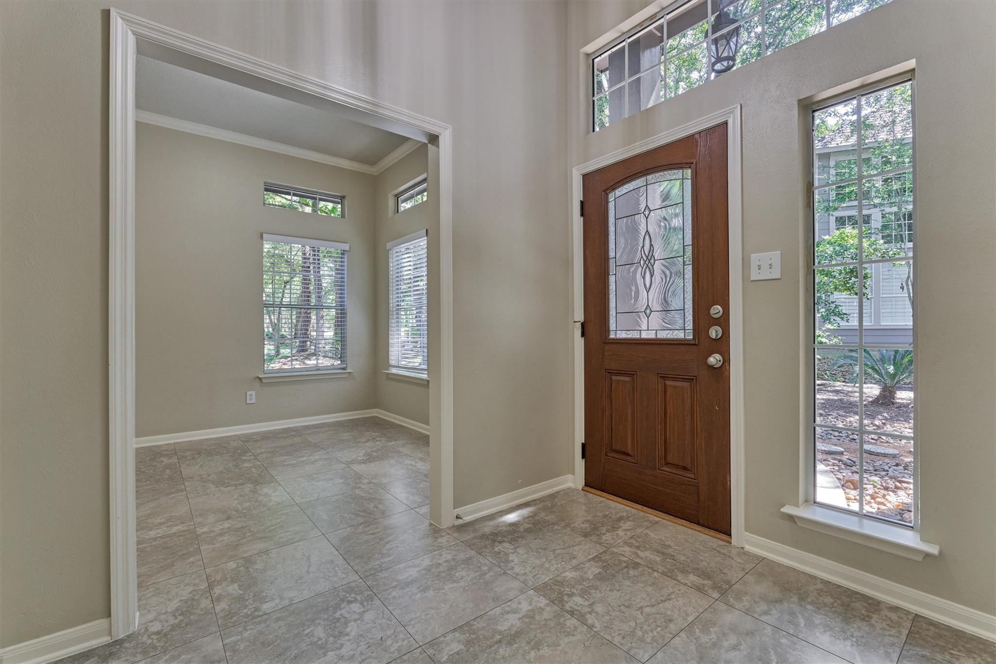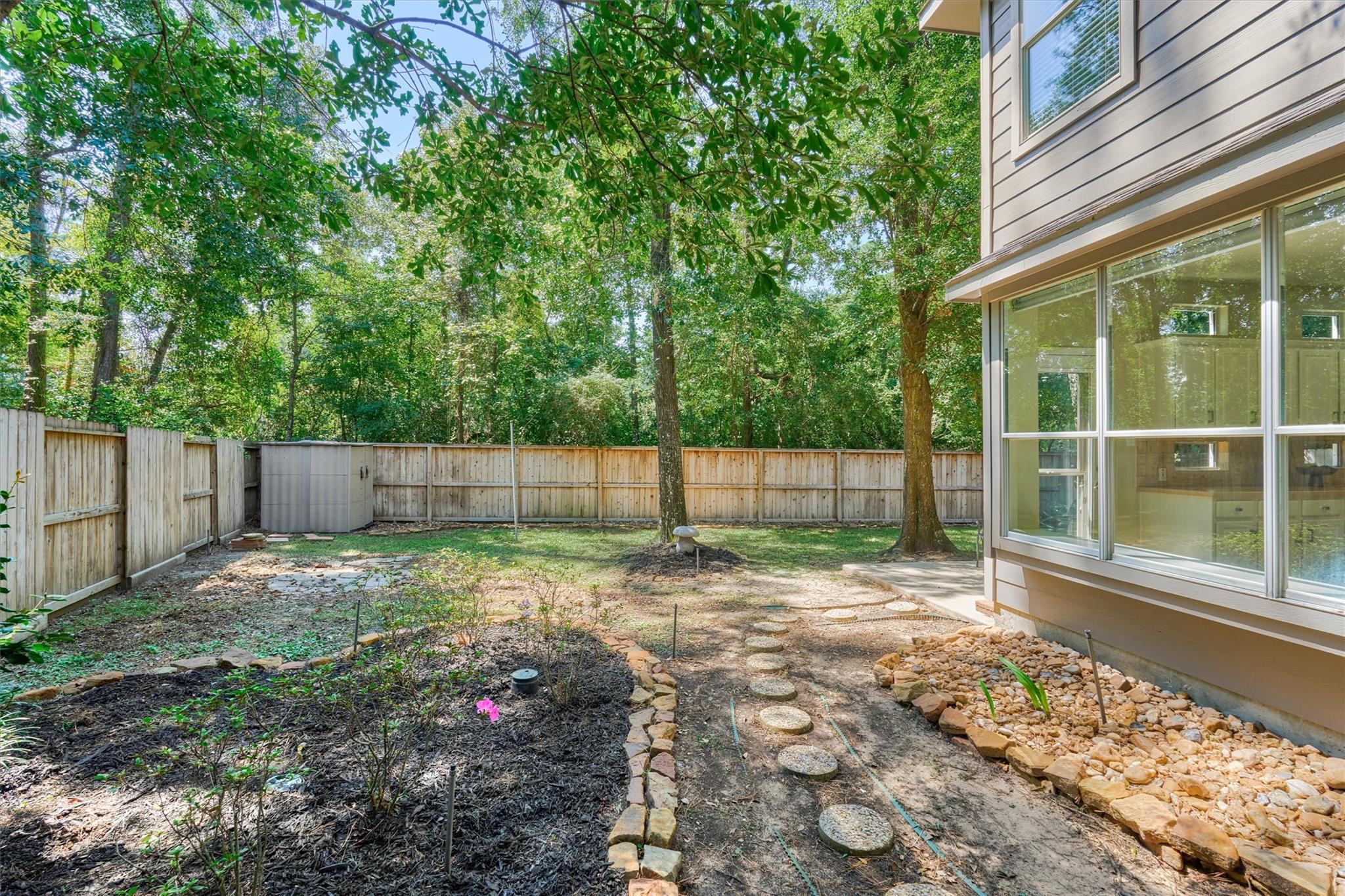 Prime Woodlands LOCATION, light, bright, and move-in ready! Lives like a SINGLE FAMILY! This beautifully updated home offers soaring ceilings, stunning two-story windows in the family living space with fireplace, and a private fenced backyard with NO REAR NEIGHBORS. 1ST FLOOR PRIMARY BEDROOM w/direct utility room access. The spacious kitchen is the heart of the home, featuring a granite island, NEWER Kohler PRO sink & faucet, UPDATED GAS COOKTOP, OVEN & MICROWAVE & included refrigerator. Formal dining + a private study or 4th bedroom option, provide flexibility for today's lifestyle. Upstairs you'll find a large GAMEROOM, w/additional FLEX SPACE, STORAGE! Recent 2025 updates include NEW H20 Heater, granite counters in the primary bath, updated lighting, refreshed half bath with granite vanity, garage door opener, disposal. HOA maintains the front lawn. Zoned to sought-after WOODLANDS HIGH SCHOOL, with a low tax rate. Near I-45, Hwy 242, EXXONMOBIL, shopping, hospitals, Hughes Landing.