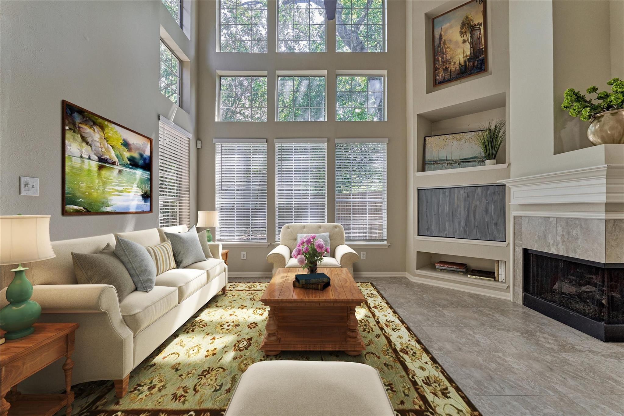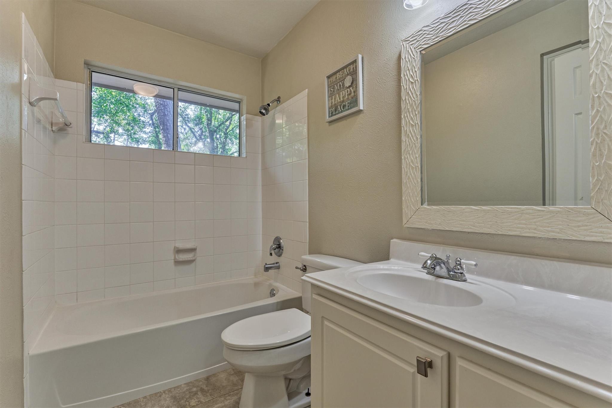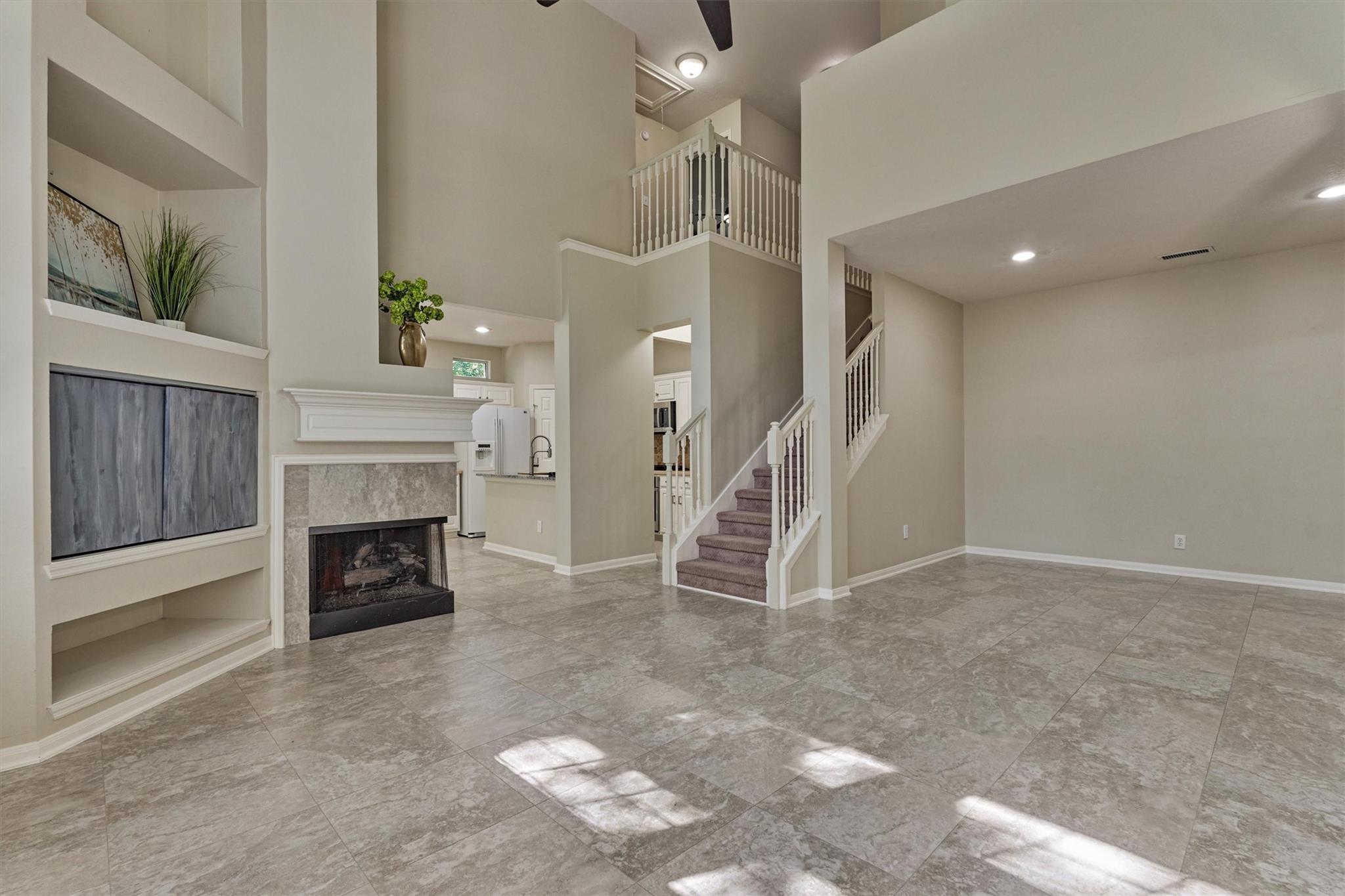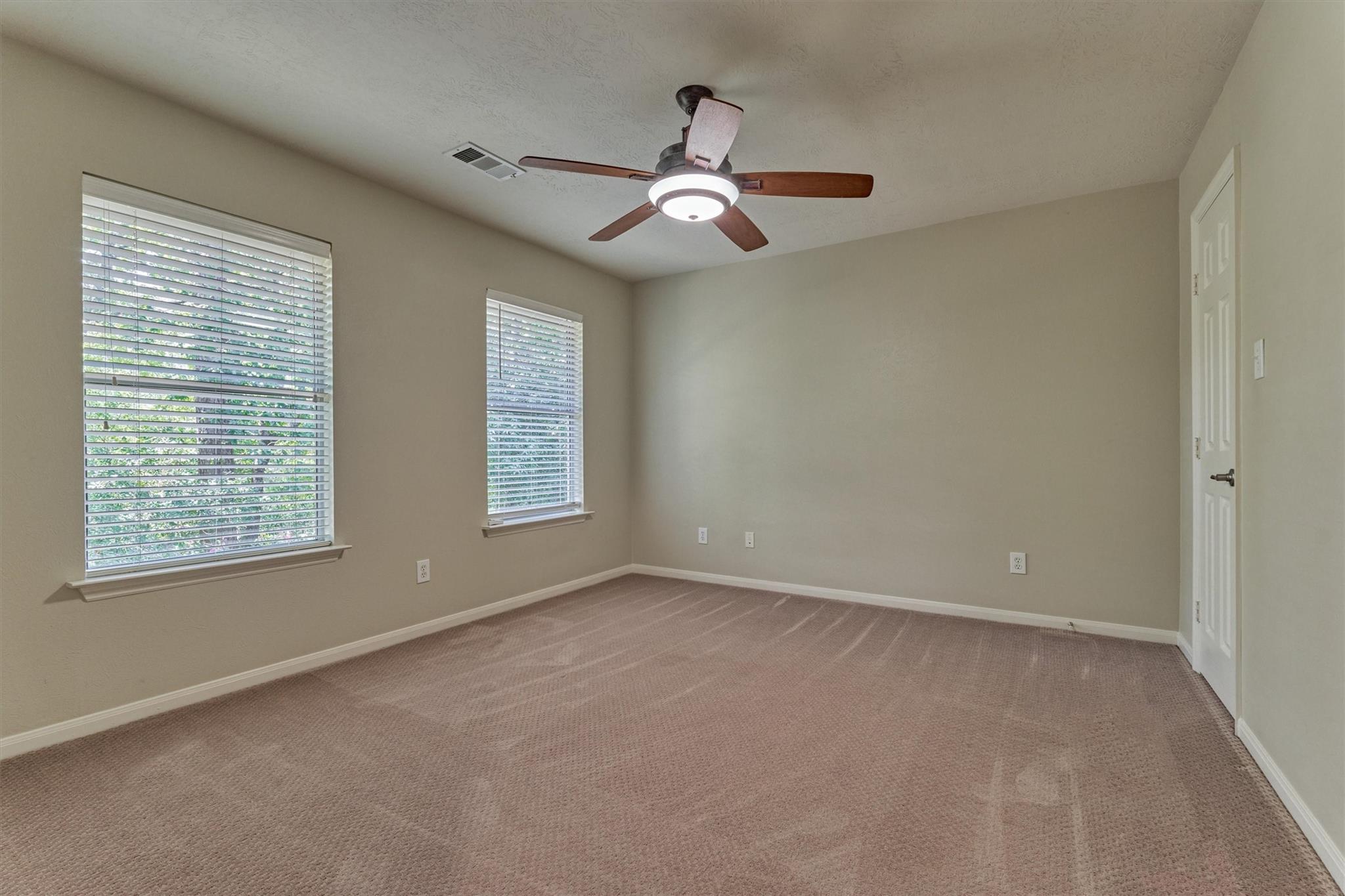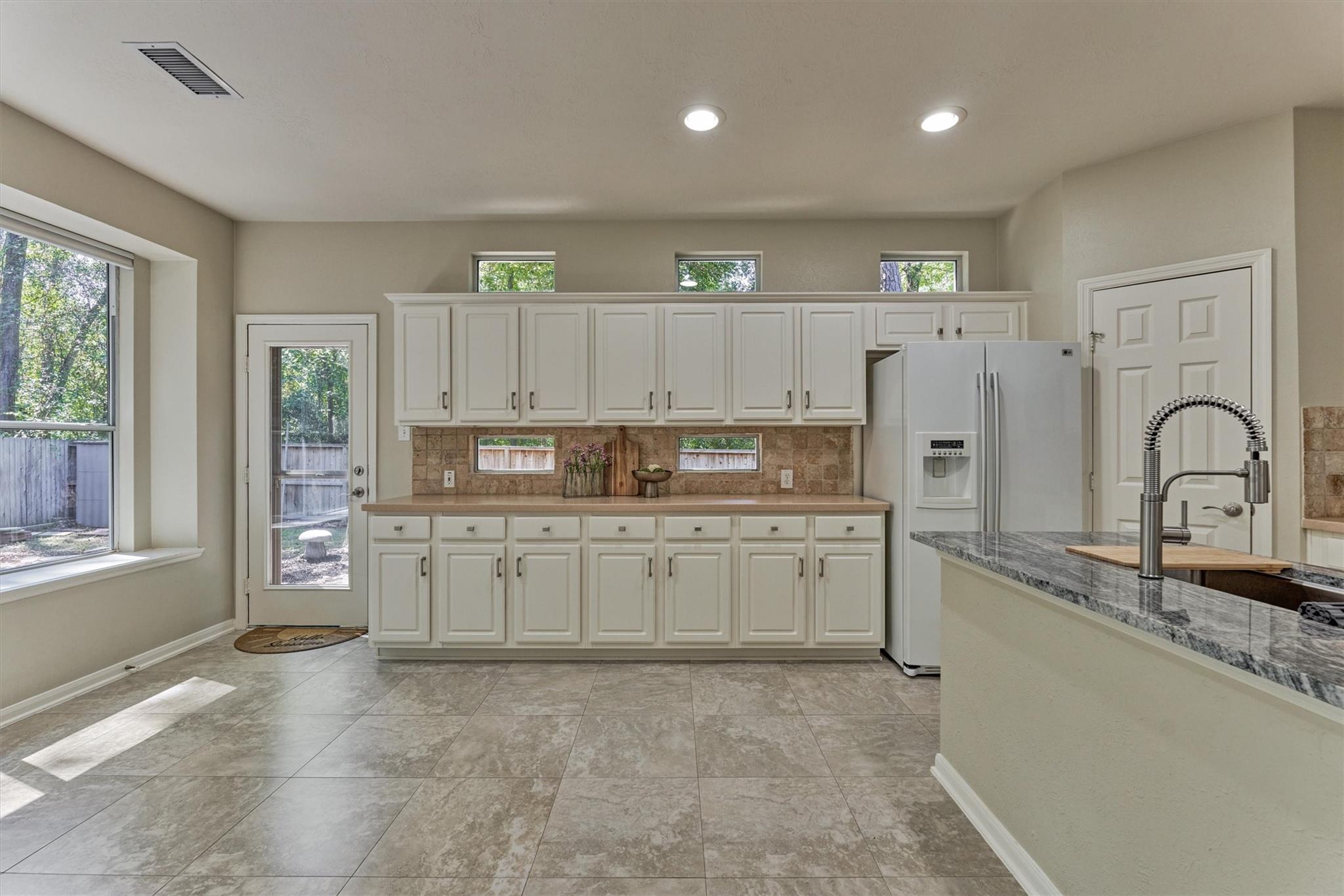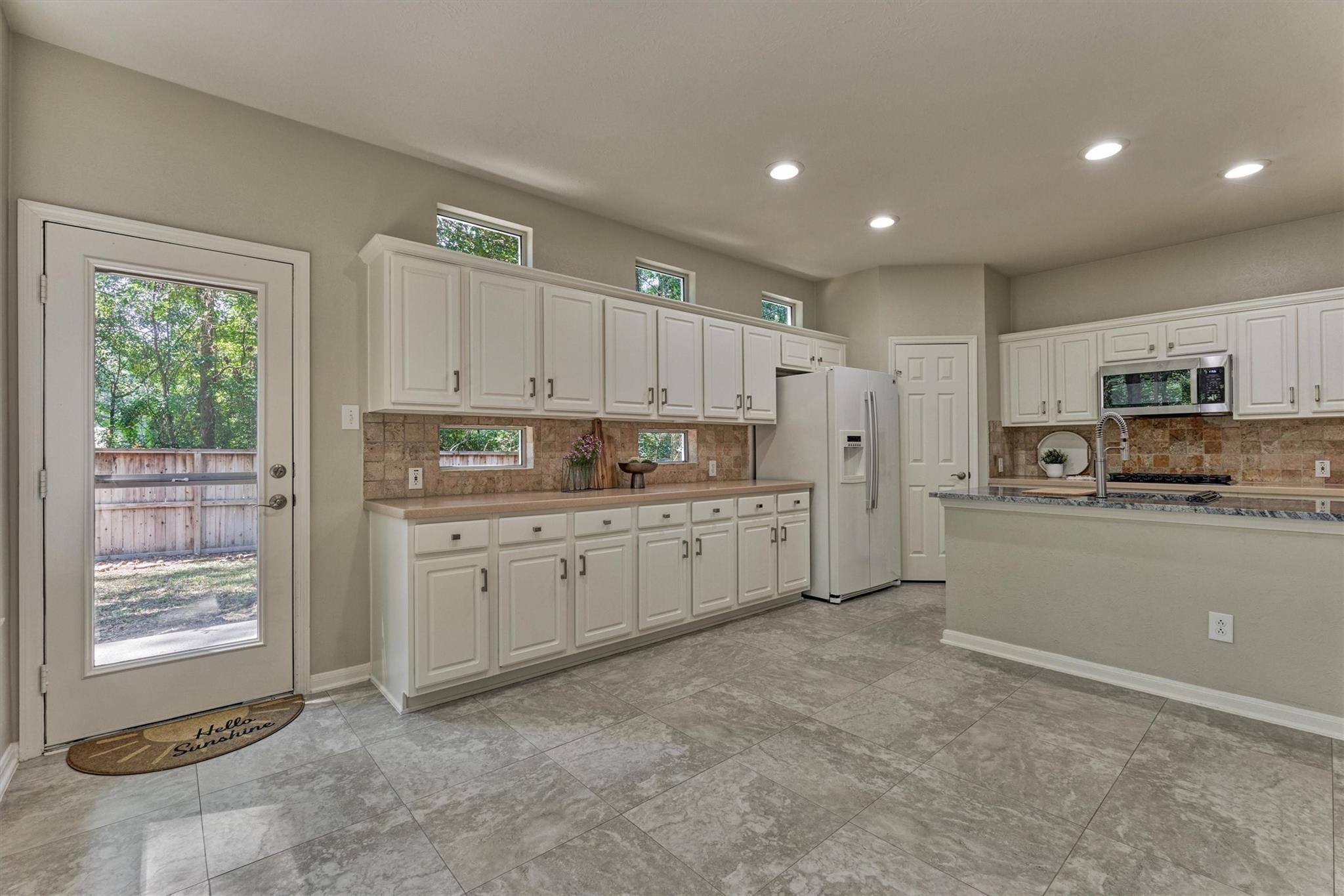 Prime Woodlands LOCATION, light, bright, and move-in ready! Lives like a SINGLE FAMILY! This beautifully updated home offers soaring ceilings, stunning two-story windows in the family living space with fireplace, and a private fenced backyard with NO REAR NEIGHBORS. 1ST FLOOR PRIMARY BEDROOM w/direct utility room access. The spacious kitchen is the heart of the home, featuring a granite island, NEWER Kohler PRO sink & faucet, UPDATED GAS COOKTOP, OVEN & MICROWAVE & included refrigerator. Formal dining + a private study or 4th bedroom option, provide flexibility for today's lifestyle. Upstairs you'll find a large GAMEROOM, w/additional FLEX SPACE, STORAGE! Recent 2025 updates include NEW H20 Heater, granite counters in the primary bath, updated lighting, refreshed half bath with granite vanity, garage door opener, disposal. HOA maintains the front lawn. Zoned to sought-after WOODLANDS HIGH SCHOOL, with a low tax rate. Near I-45, Hwy 242, EXXONMOBIL, shopping, hospitals, Hughes Landing.