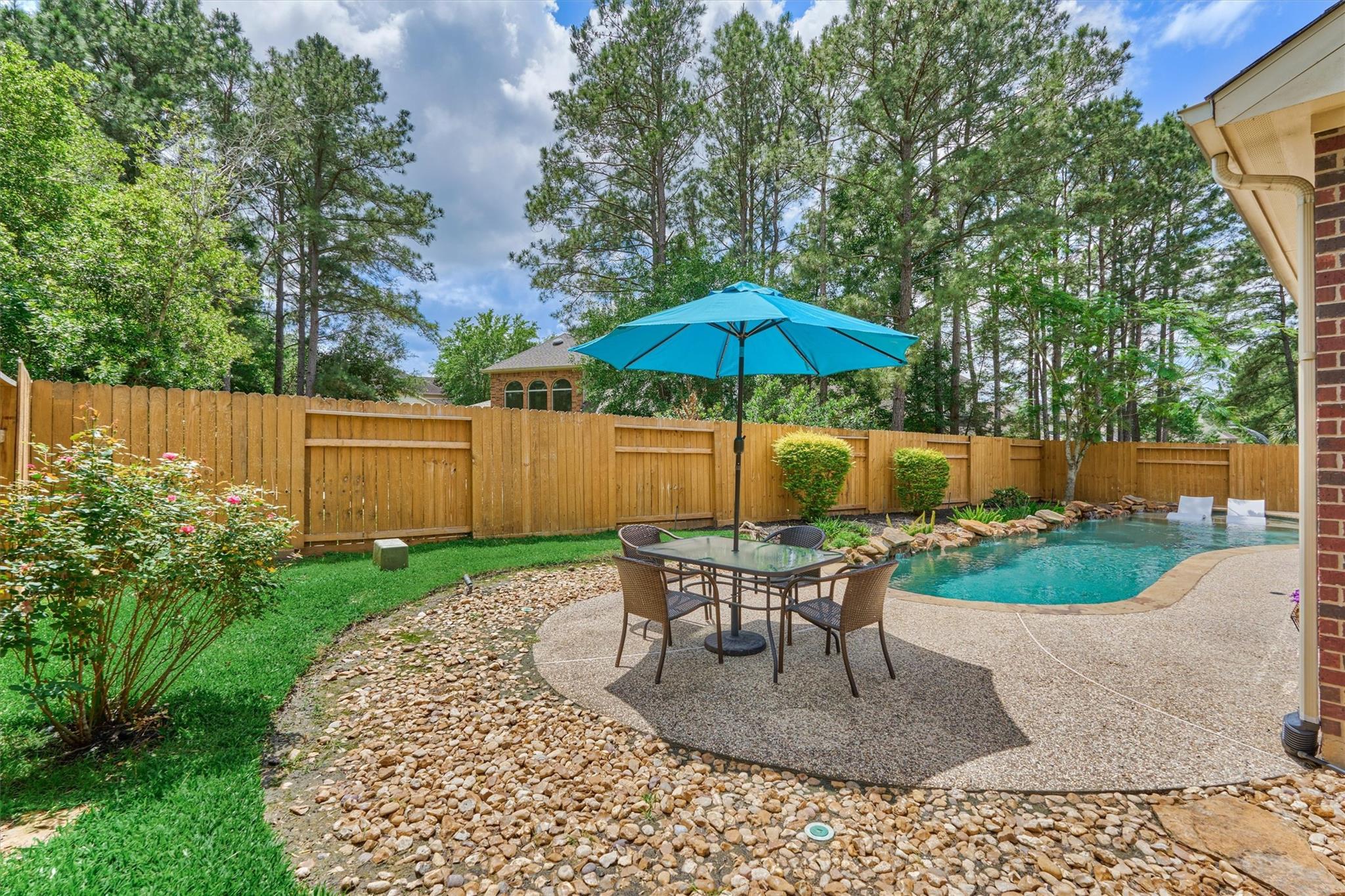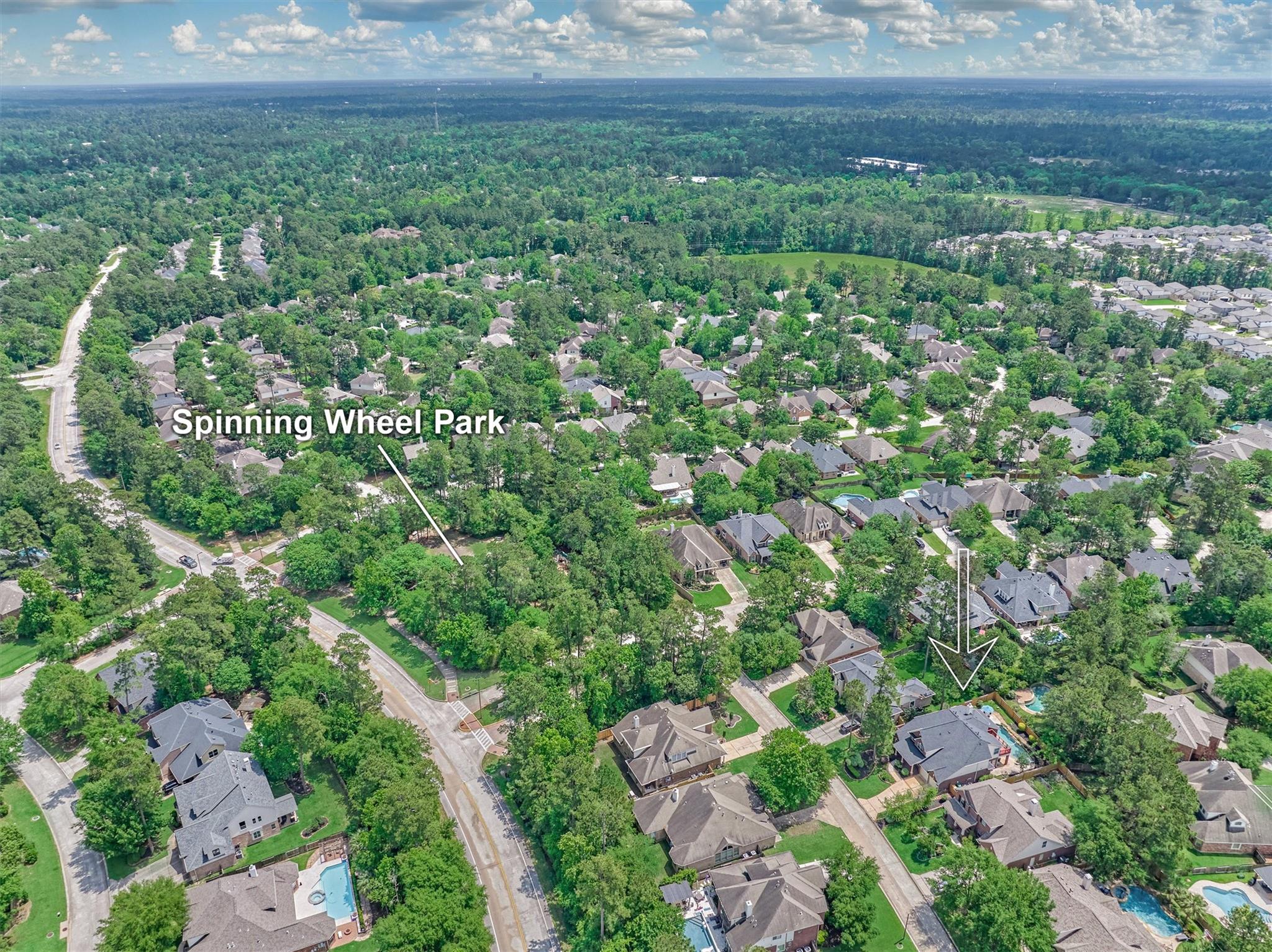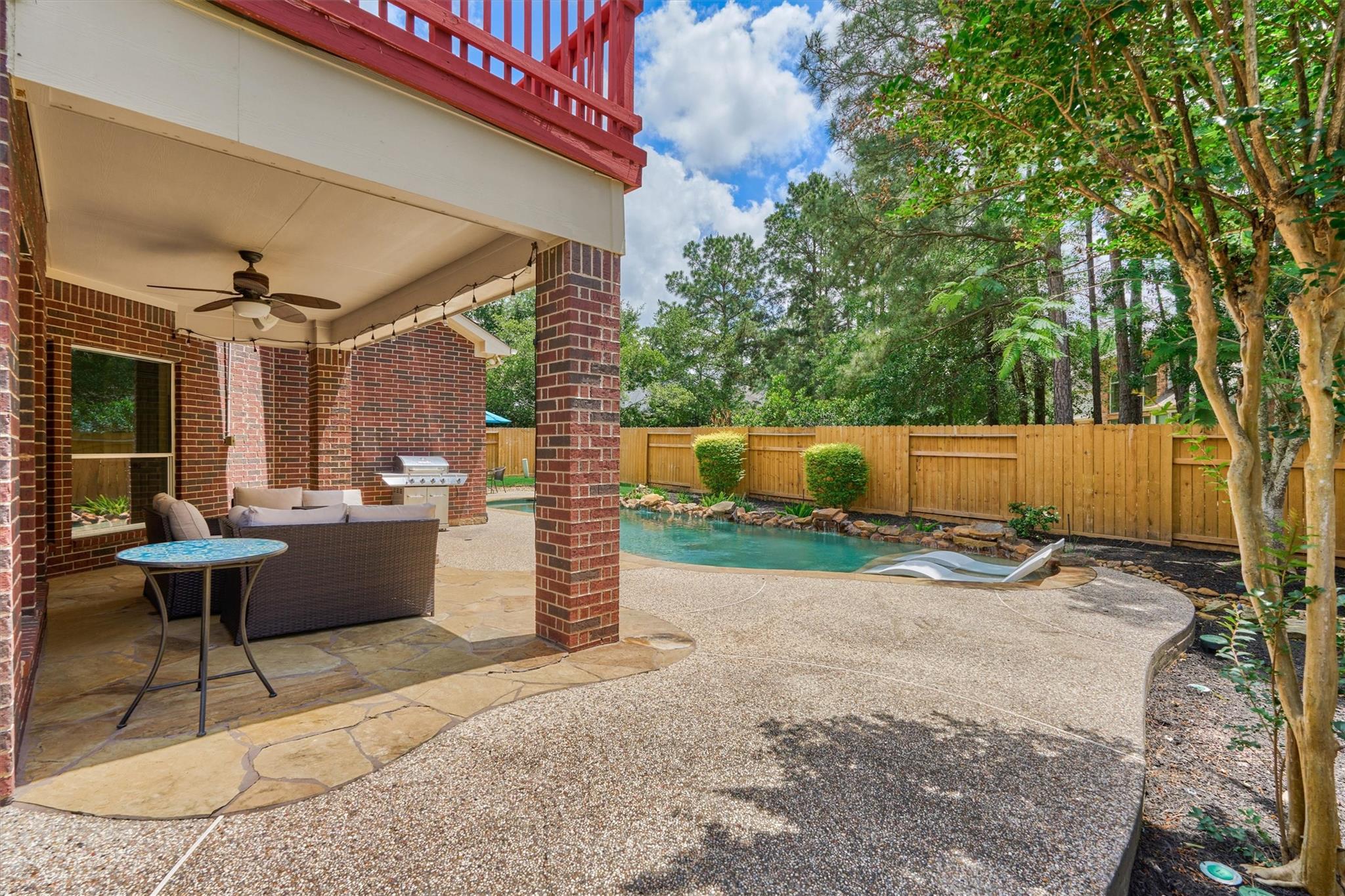 CHARMING FORMER MODEL HOME with inviting front porch & beautifully refreshed interior offers timeless appeal, superior flow & everyday functionality in a prime Woodlands location! Freshly painted interior + new carpeting set the stage for this well-appointed 4 BR layout featuring both formals, enclosed home office, and a spacious den filled with natural light overlooking a private backyard oasis w/sparkling pool & mature landscaping! Chef's kitchen shines w/SS appls, dbl ovens, W-I pantry, wine fridge, abundant prep space & seamless flow for entertaining! Secluded owner's retreat delivers a spa-like bath + XL walk-in closet. Upstairs hosts 3 spacious secondary BRs + game rm w/decked balcony access showcasing serene backyard views! 3-car tandem garage + bonus room for incredible flexibility! 2 WI attics - offer amazing storage! Enjoy close proximity to parks, trails, top-rated schools, and premier shopping/dining in The Woodlands--an exceptional opportunity! This one won't last long!