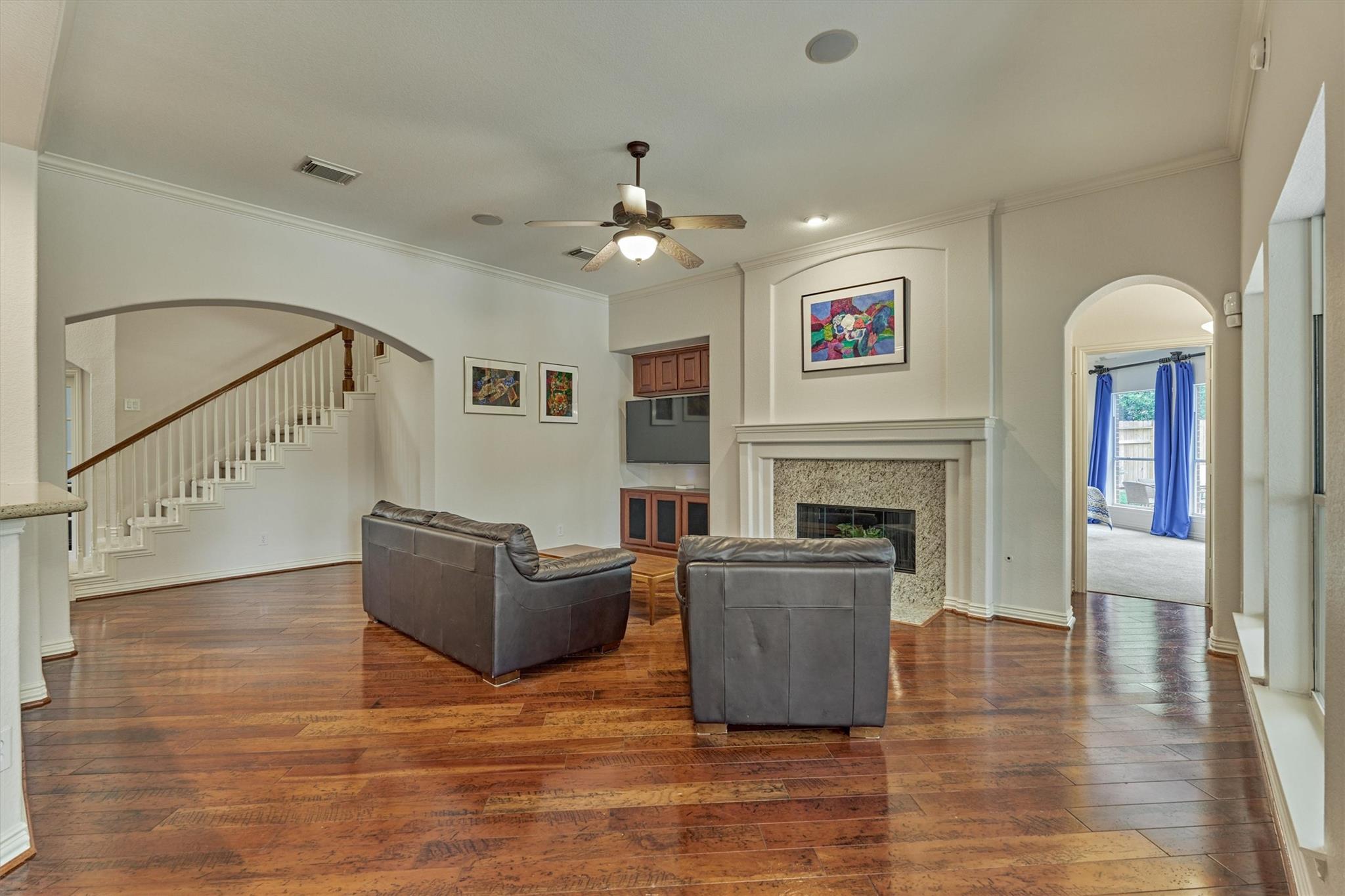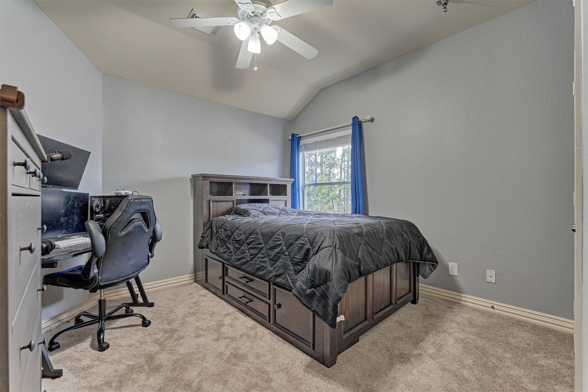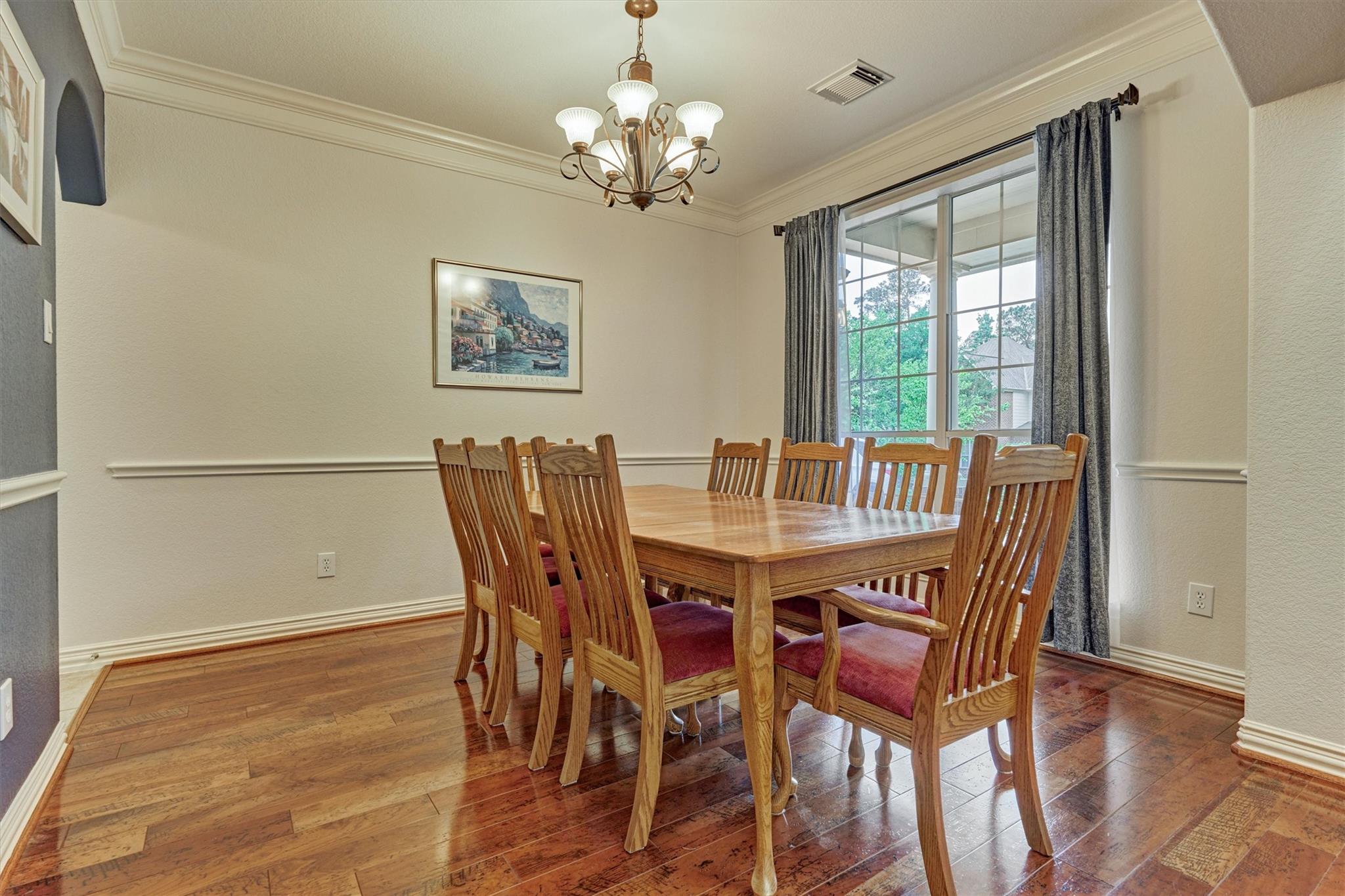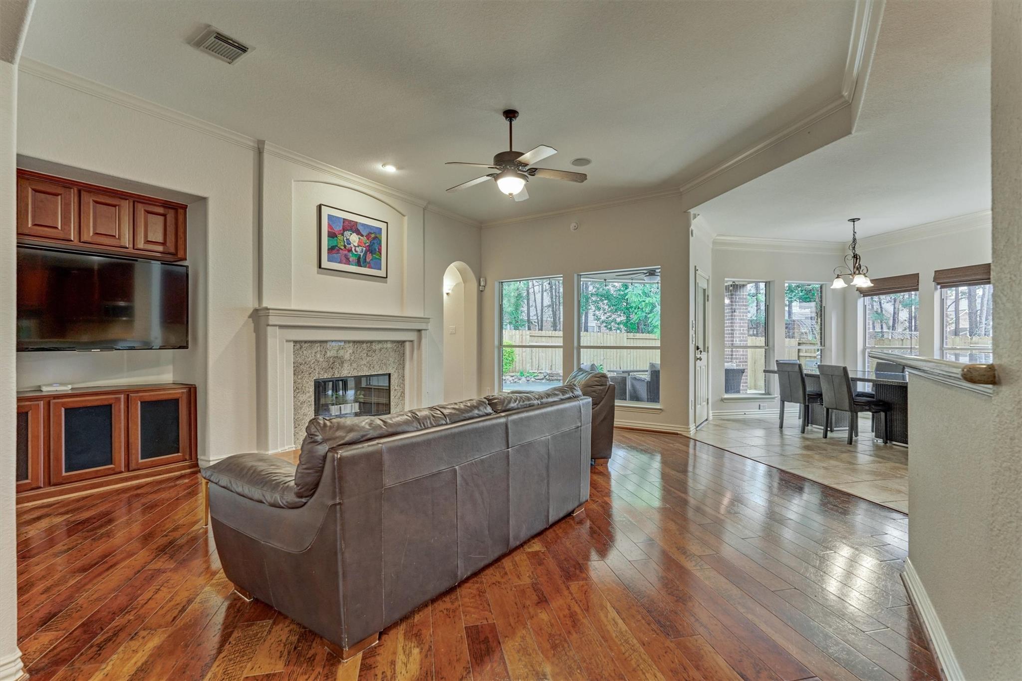 CHARMING FORMER MODEL HOME with inviting front porch & beautifully refreshed interior offers timeless appeal, superior flow & everyday functionality in a prime Woodlands location! Freshly painted interior + new carpeting set the stage for this well-appointed 4 BR layout featuring both formals, enclosed home office, and a spacious den filled with natural light overlooking a private backyard oasis w/sparkling pool & mature landscaping! Chef's kitchen shines w/SS appls, dbl ovens, W-I pantry, wine fridge, abundant prep space & seamless flow for entertaining! Secluded owner's retreat delivers a spa-like bath + XL walk-in closet. Upstairs hosts 3 spacious secondary BRs + game rm w/decked balcony access showcasing serene backyard views! 3-car tandem garage + bonus room for incredible flexibility! 2 WI attics - offer amazing storage! Enjoy close proximity to parks, trails, top-rated schools, and premier shopping/dining in The Woodlands--an exceptional opportunity! This one won't last long!
