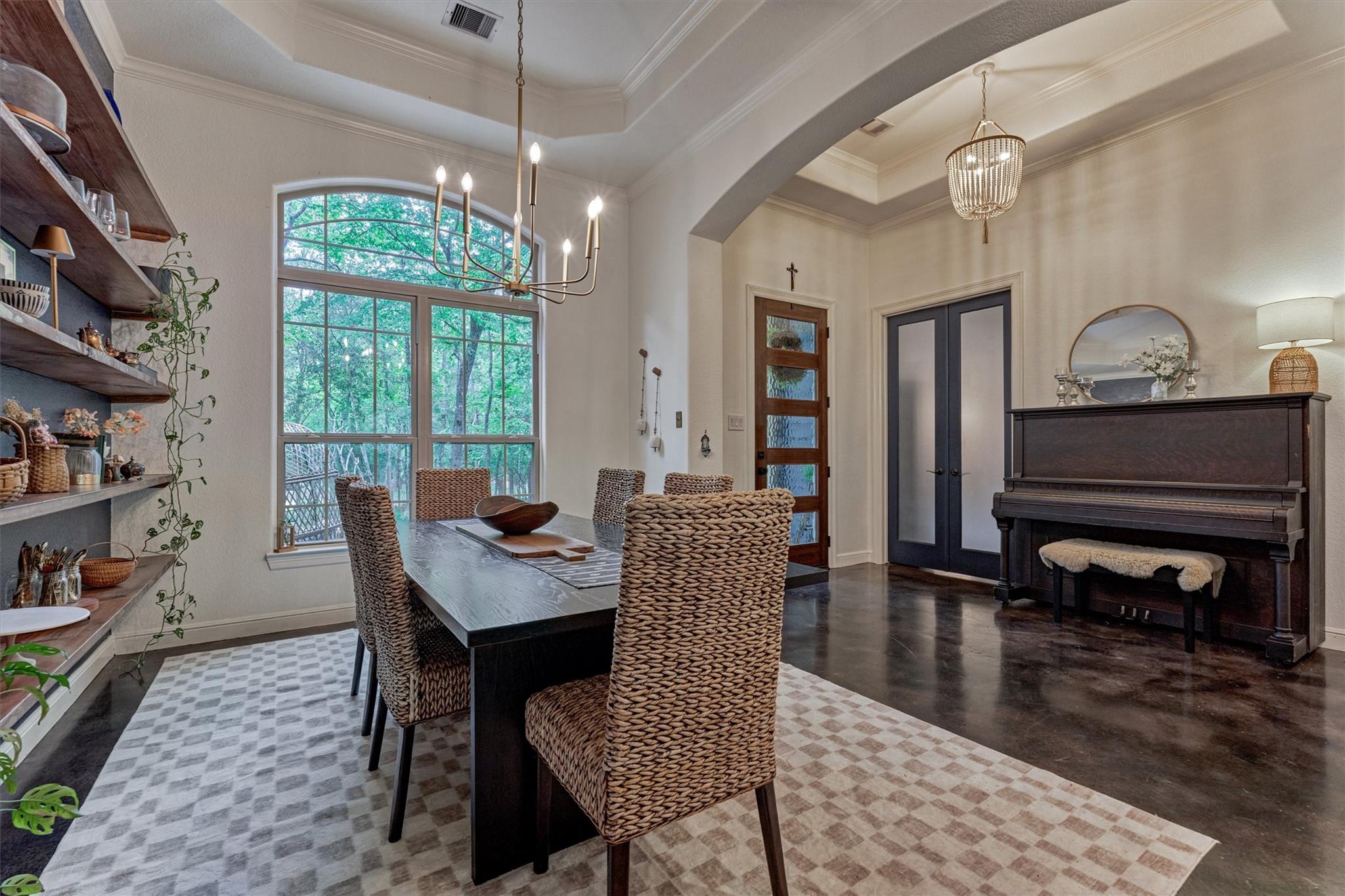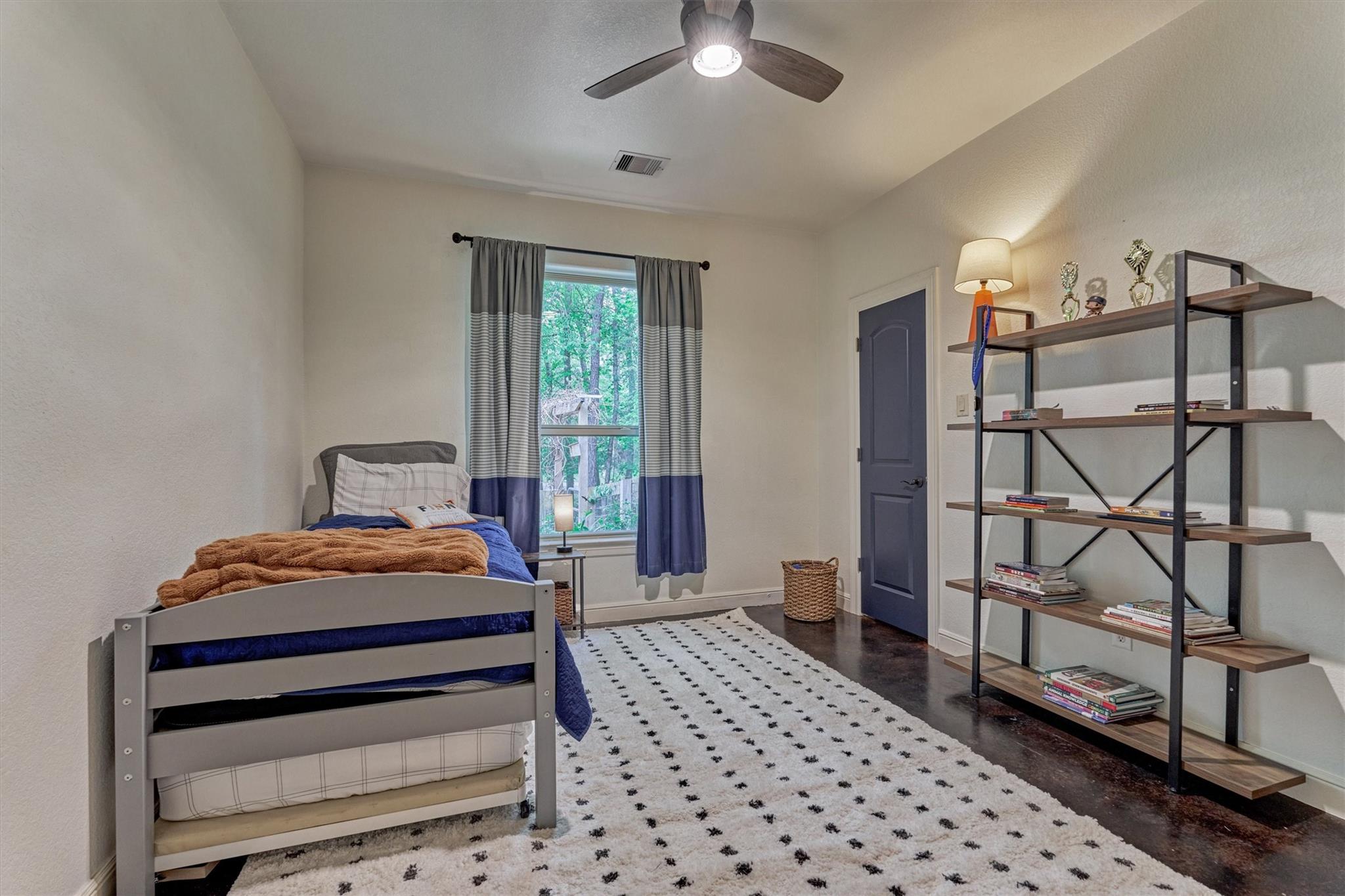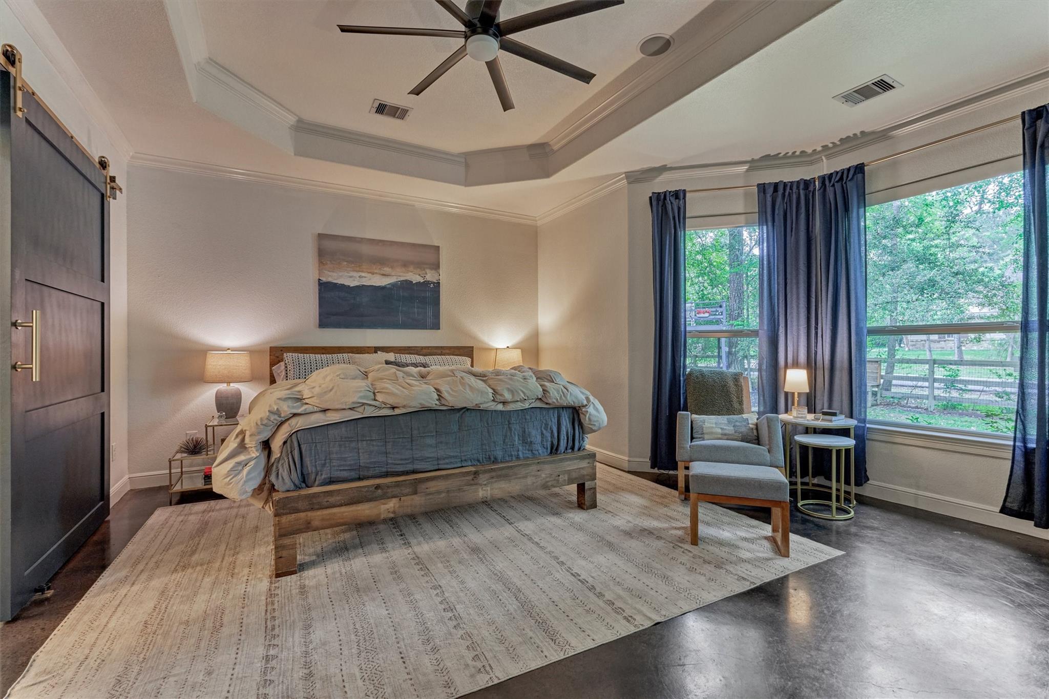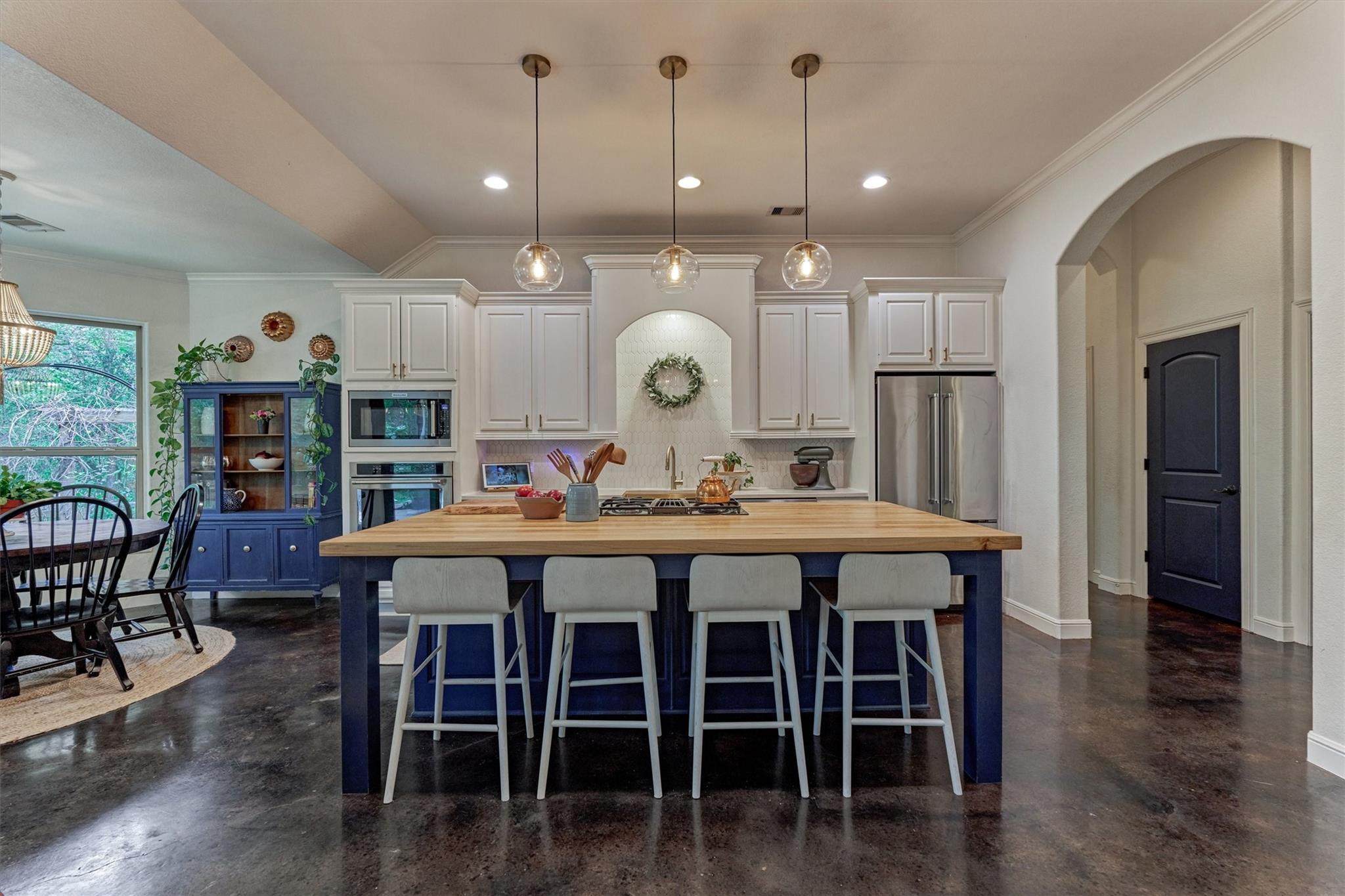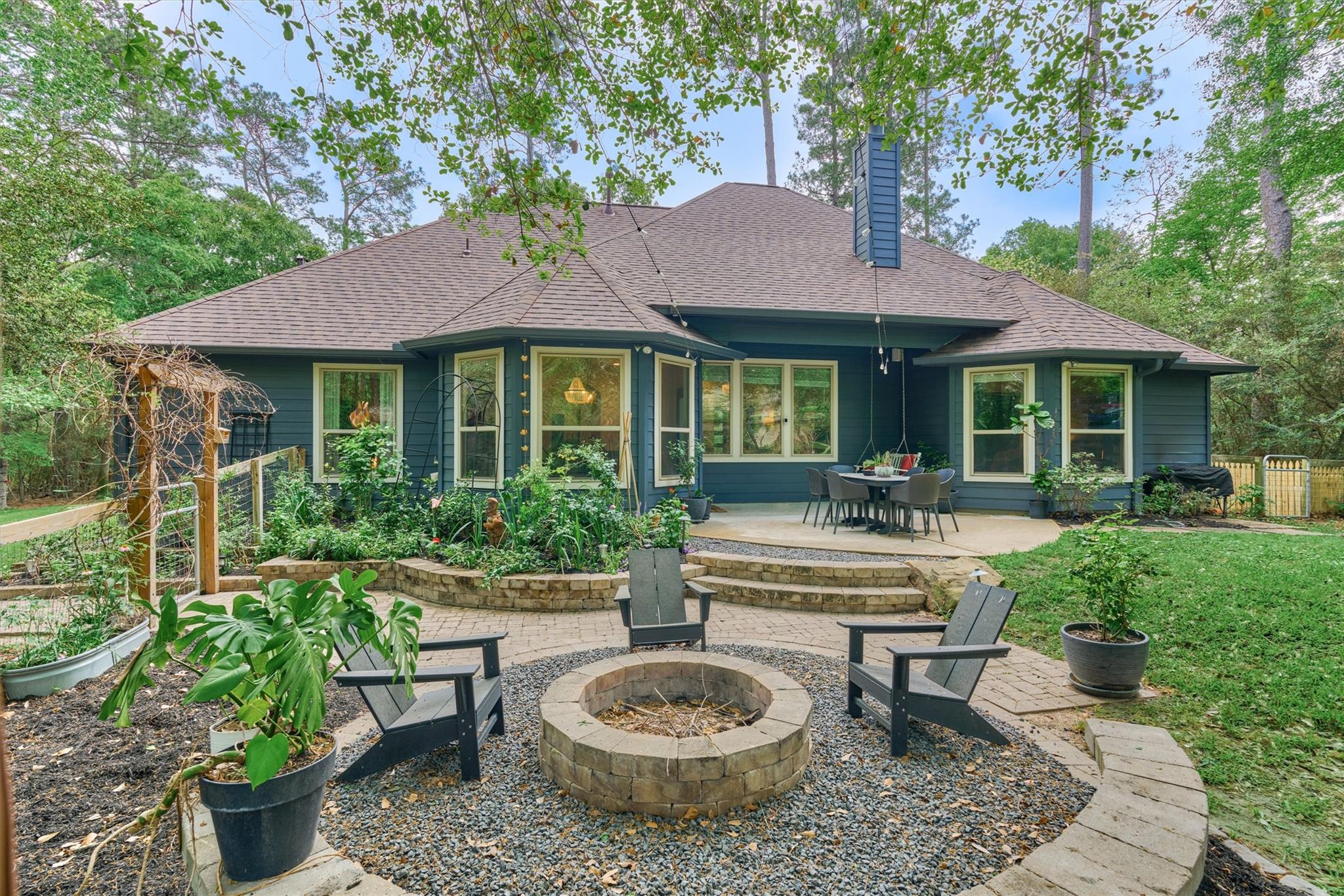 THIS ENCHANTING 1-STORY RETREAT, rich with character & designer touches, epitomizes quaint country living on a sprawling .78-ac. lot in "Mayberry-esque" Stagecoach community w/small-town charm, low HOA, and offers a perfect blend of peaceful, rural living w/everyday conveniences! BRAND NEW ROOF & showcasing artisan flair throughout with coffered/tray ceilings, archways & concrete flooring, this inviting home features a chef's kitchen w/butcher block island, gas cooktop & bar seating, seamlessly opening to a cozy den w/fireplace & sunlit breakfast rm overlooking a serene backyard patio w/firepit--ideal for relaxing or entertaining! Formal dining rm + enclosed home ofc for ultimate flexibility! Secluded owner's retreat features a luxe bath w/soaking tub & separate shower! Spacious secondary BRs + Hollywood bath! Endless possibilities for outdoor living, gardening or future additions! Savor country vibes minutes from shops/dining/entertainment venues, easy access to Grand Pkwy, 249! Hurry!
