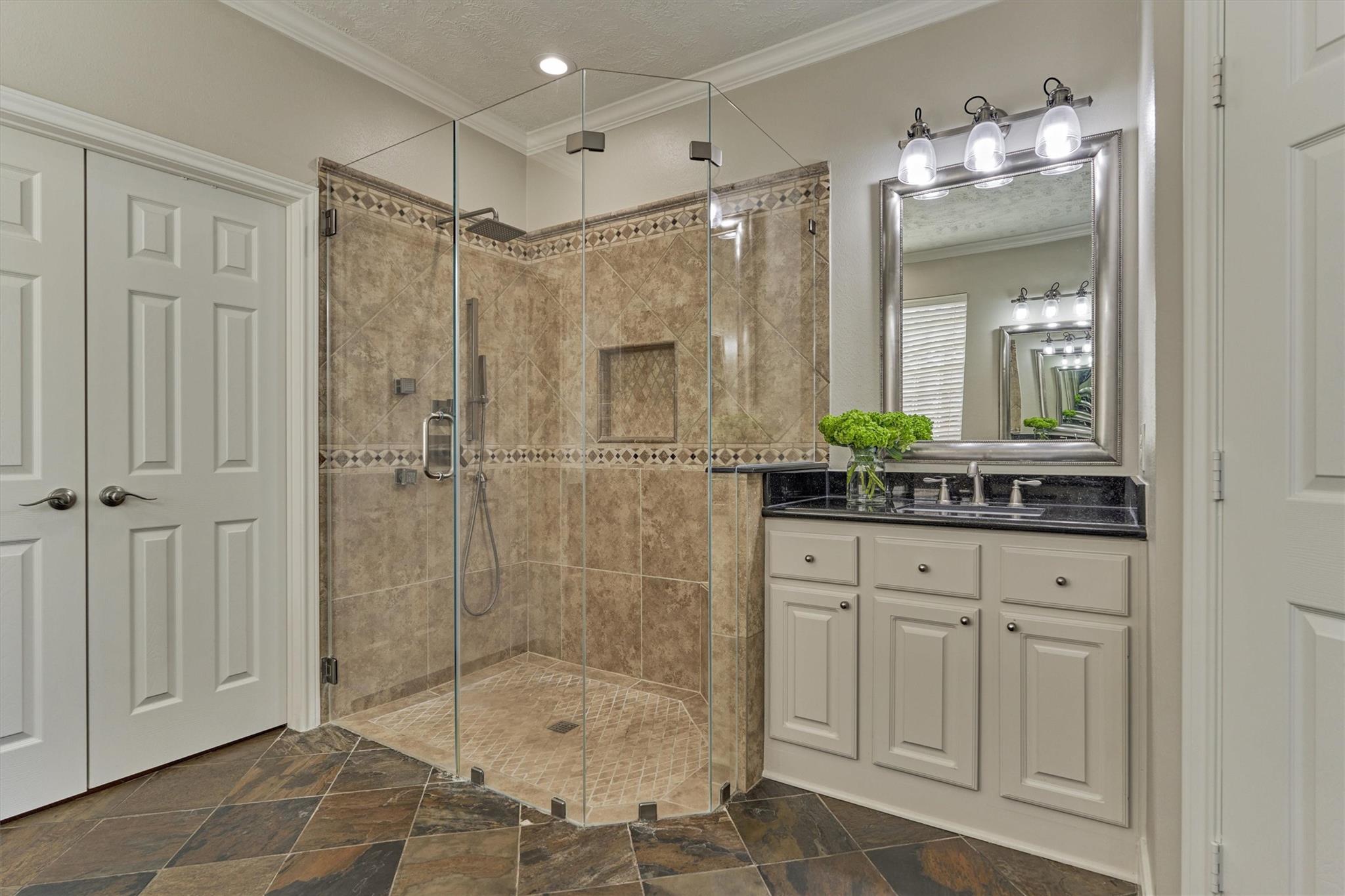 STUNNING CURB APPEAL & "MINT CONDITION" INTERIOR with fine appointments throughout on this oversized lot showcasing rare breadth & depth in front & back, backing to permanent green space/no rear neighbor for ultimate privacy! Popular 5 BR floor plan shines with designer touches, superior flow & function, energy-efficient double pane windows, soaring ceilings, resort-style outdoor living area highlighted by 38' saltwater pool & spa, and amazing storage including huge decked attic w/door entry! Boasting an enclosed study, formal dining rm w/easy access to gourmet kitchen w/premium stainless appls, bar seating, abundant prep/storage opening to den w/vaulted ceiling, dramatic fireplace & wall of wdws overlooking backyard paradise! Secluded owner's retreat offers serene pool & greenbelt views + luxe bath & XL closet w/smart built-ins. 4 spacious BRs upstairs w/updated baths! Game rm w/covered balcony to soak up nature views! Walk/ride to park, playground, shopping/dining hub/Trader Joe's!