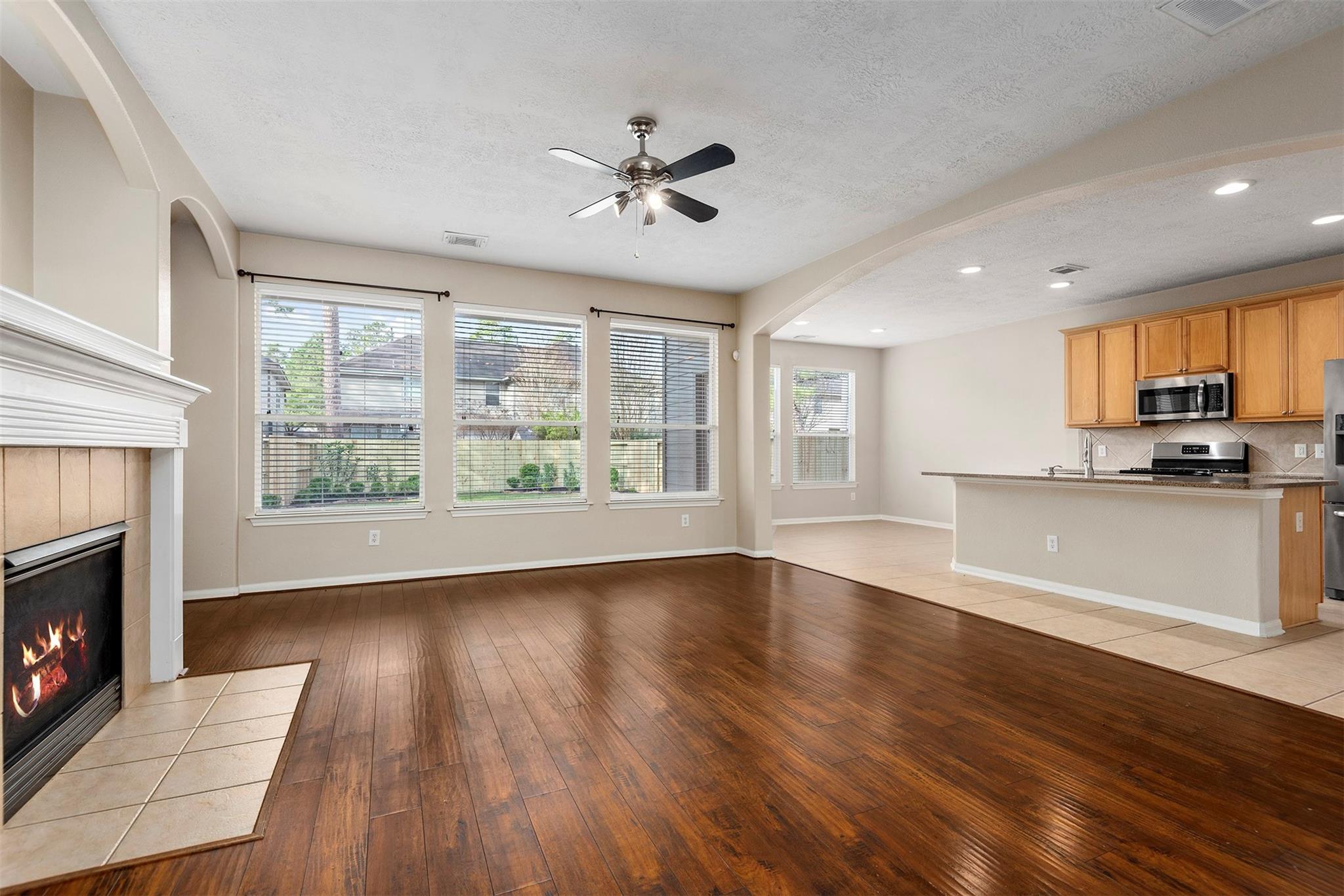 ***LL has accepted a lease and just waiting on checks***** BEAUTIFUL TOWNHOME OPPORTUNITY w/all the talking points incl a rare, oversized backyard + stunning front yard views of a peaceful greenbelt lined w/mature trees! Inviting open-concept floorplan features a dramatic 2-story entry & spacious den showcasing rich hardwood floors, FP w/mantle, and a wall of windows overlooking the private backyard. Generous kitchen impresses w/ample counter & cabinet space, SS appls, and a large island w/extended breakfast bar for extra seating & entertaining (fridge stays!).