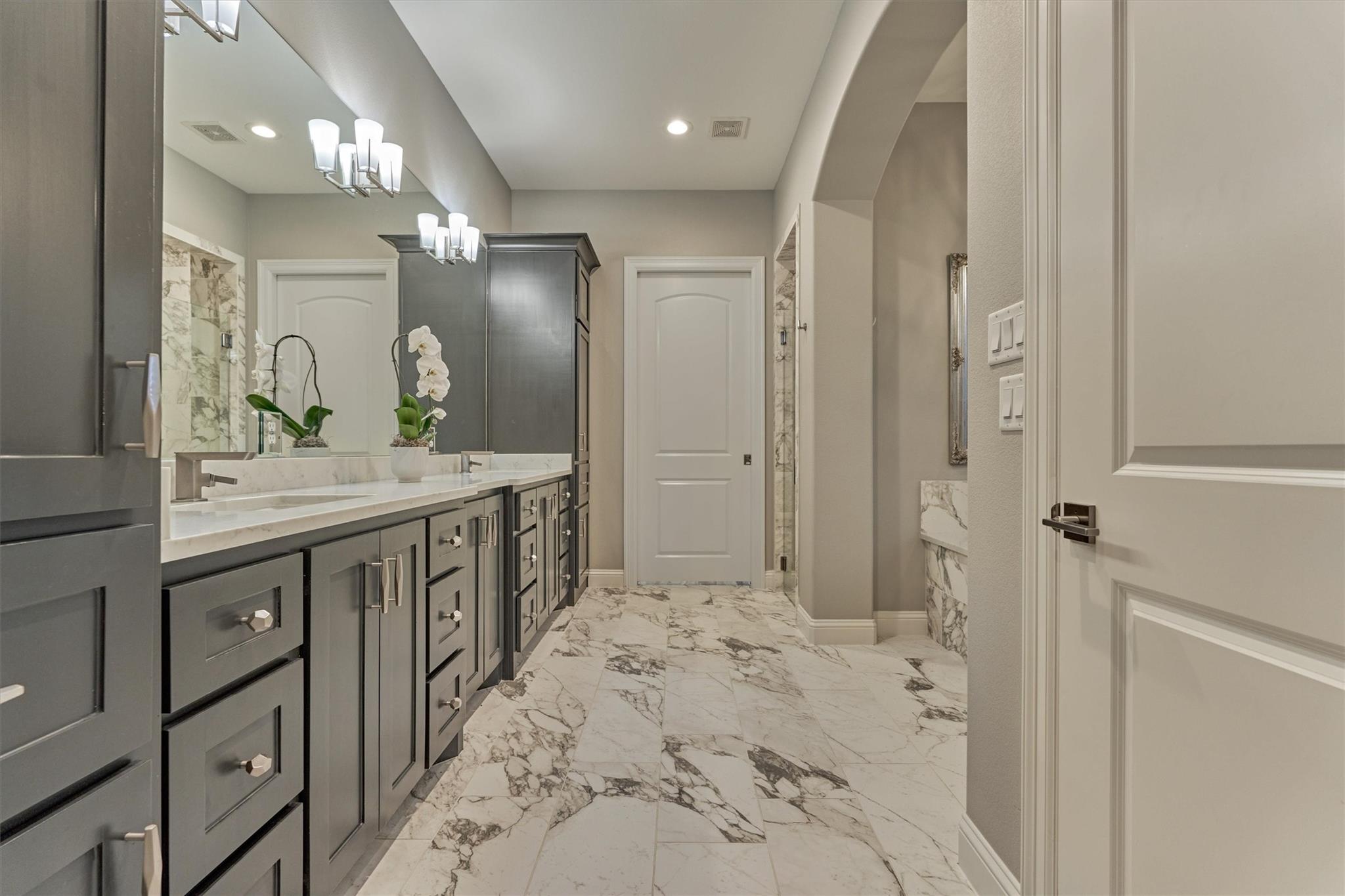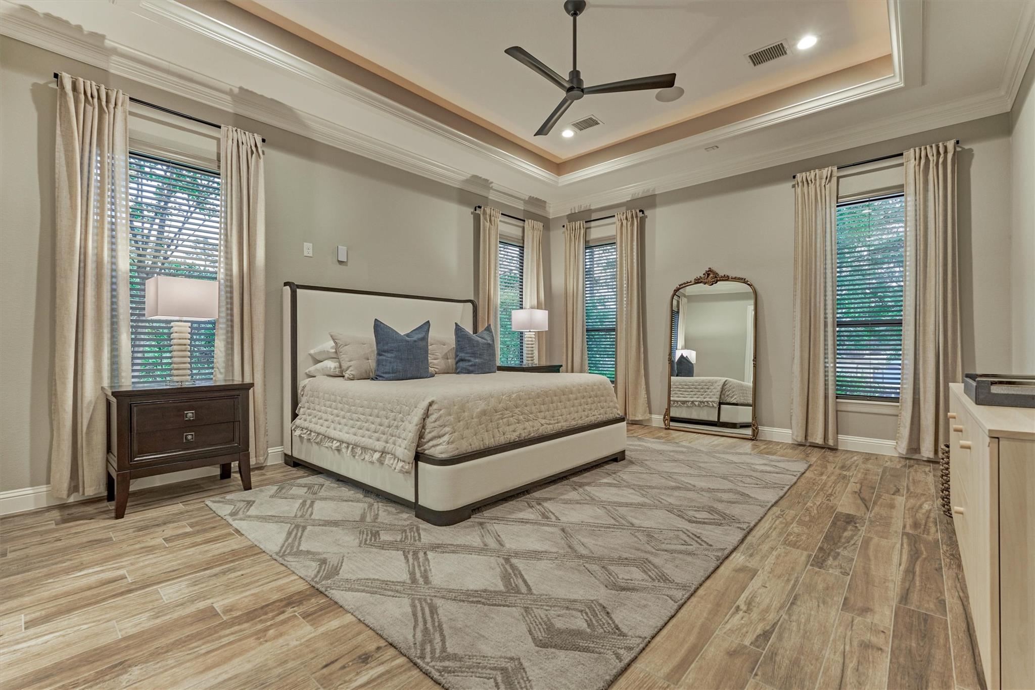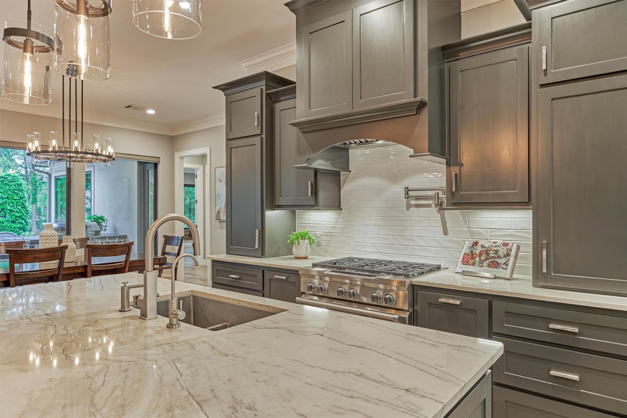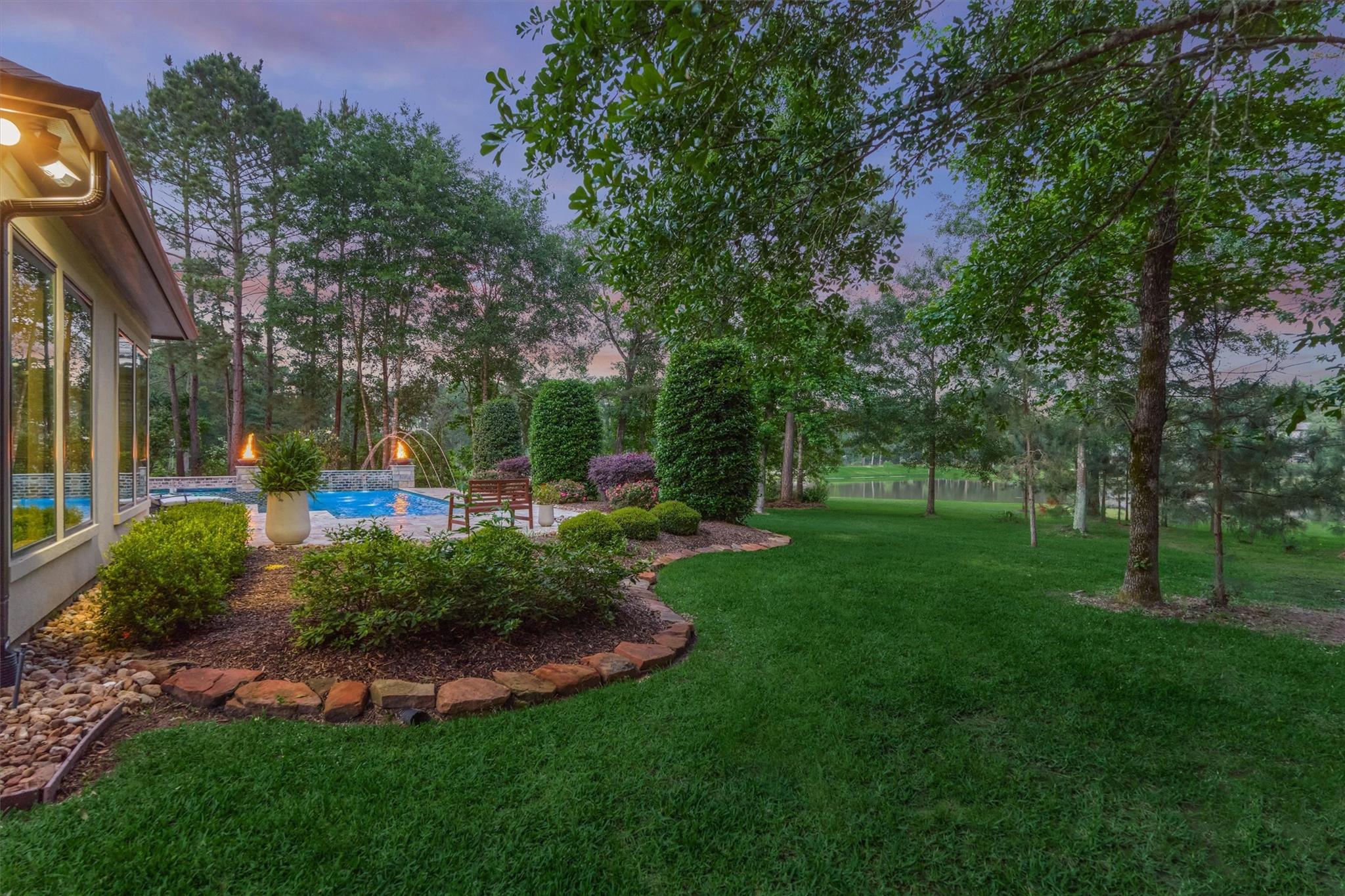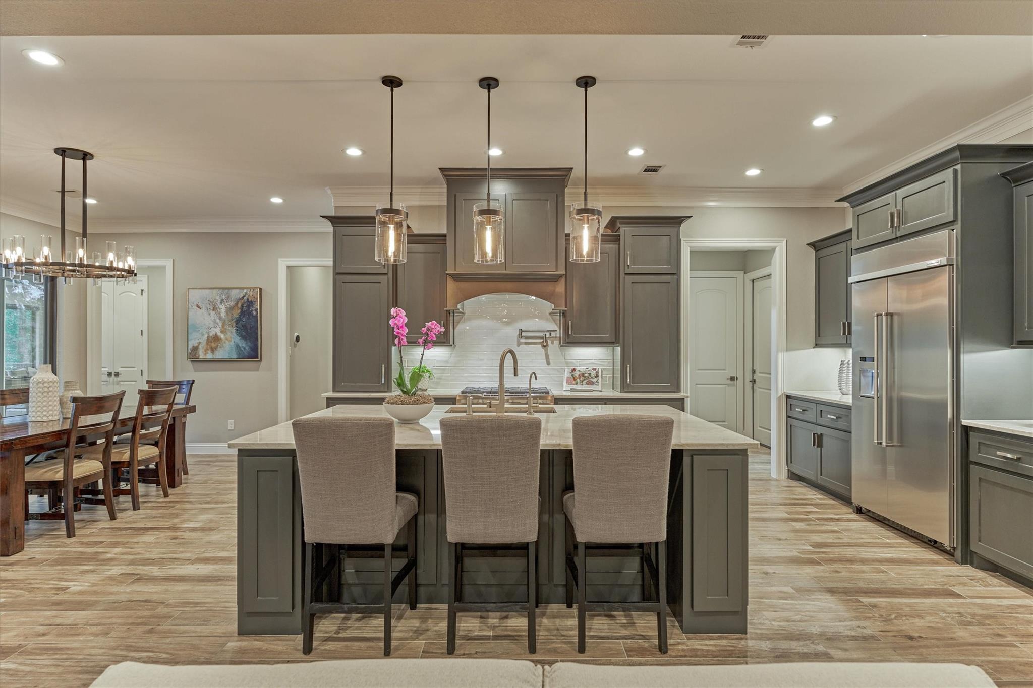 LUXURY MEETS SERENITY on this 2.2 ACRE WATERFRONT/CUL-DE-SAC lot in coveted High Meadow Estates - luxurious estate living in a peaceful setting convenient to N. Houston amenities! Savor modern-chic elegance in this transitional 1.5 story home w/premium finishes & architectural details in coffered ceilings, commercial grade sliders, gourmet kitchen w/B-I refrigerator, wine chiller, pot-filler, large block island w/bar seating, osmosis filtration system w/hot water recirculation, H20 softener & generator - priceless! Grand foyer flows into an open-concept design w/panoramic lake views incl. resort-like setting with sparkling pool & spa, aesthetic fire bowls & elaborate outdoor living area w/summer kitchen, fireplace, indoor/outdoor speaker system! Idyllic floor plan features a secluded owner's retreat w/spa-like bath, dual laundry rooms for ultra convenience, spacious secondary BRs, home ofc, game rm & flex rm upstairs! Cost-effective well water, awesome storage, security suite, MORE!