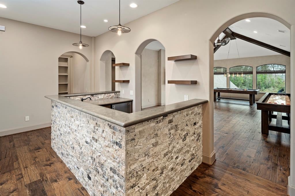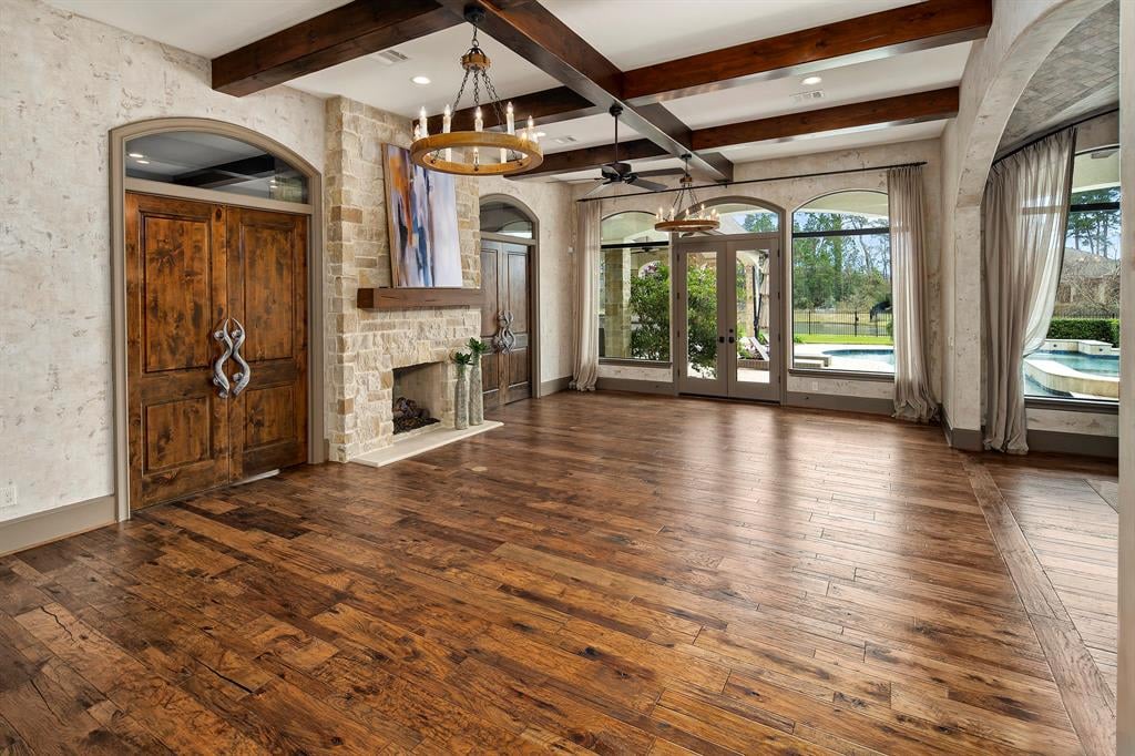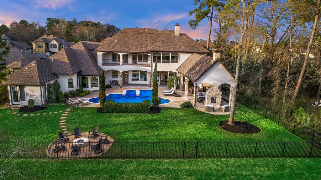SHOWCASE ESTATE HOME just outside of The Wdlds in the quiet, gated enclave of Lago Woods w/private lake-exclusive to just 45 homes! Situated on a premium waterfront lot, this Matt Powers custom exhibits masterful craftsmanship & architectural elements, striking a perfect balance in hard/water/landscape design: groin vaulted ceilings, artisan carpentry finishes/hardware, Old World accents meet modern elegance! Chef's kitchen w/Thermador range, large/breakfast island, lighted display cabs, concealed catering/bakers kitchen w/extra appls, large den & rec rm downstairs + secluded guest suite w/liv area, private study, and luxurious owners retreat w/separate clsts/commodes! Game rm & media rm w/stage upstairs plus en suite BR's, craft rm/2nd office, bonus rm, 2 utility rooms, oversized mud rm, planning nook/gift wrapping area + hidden storage rooms! Backyard oasis features large pavilion, fireplace, outdoor kit, sparkling pool/spa, pool bath, fire pit, potting rm, garden plats! High & dry!