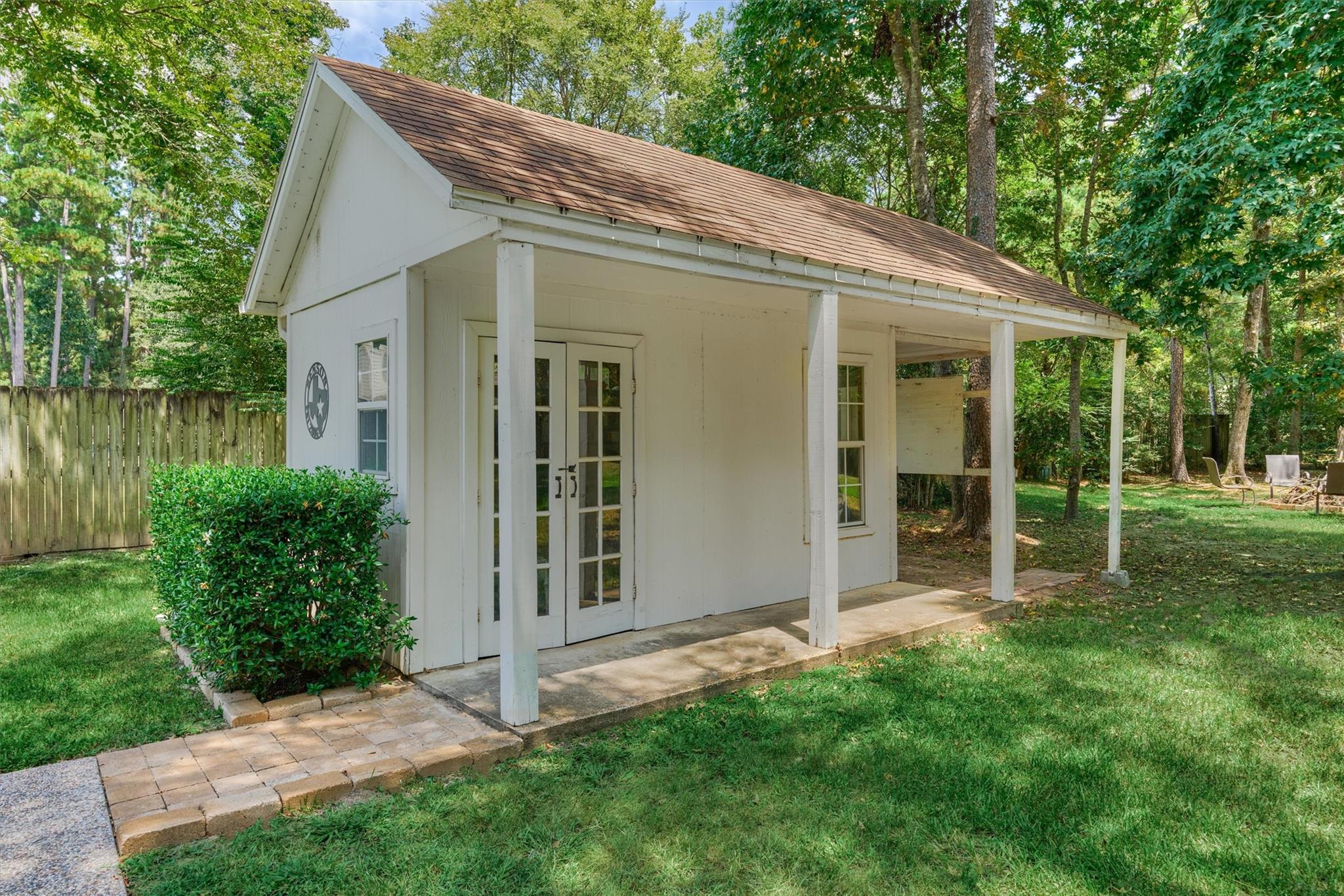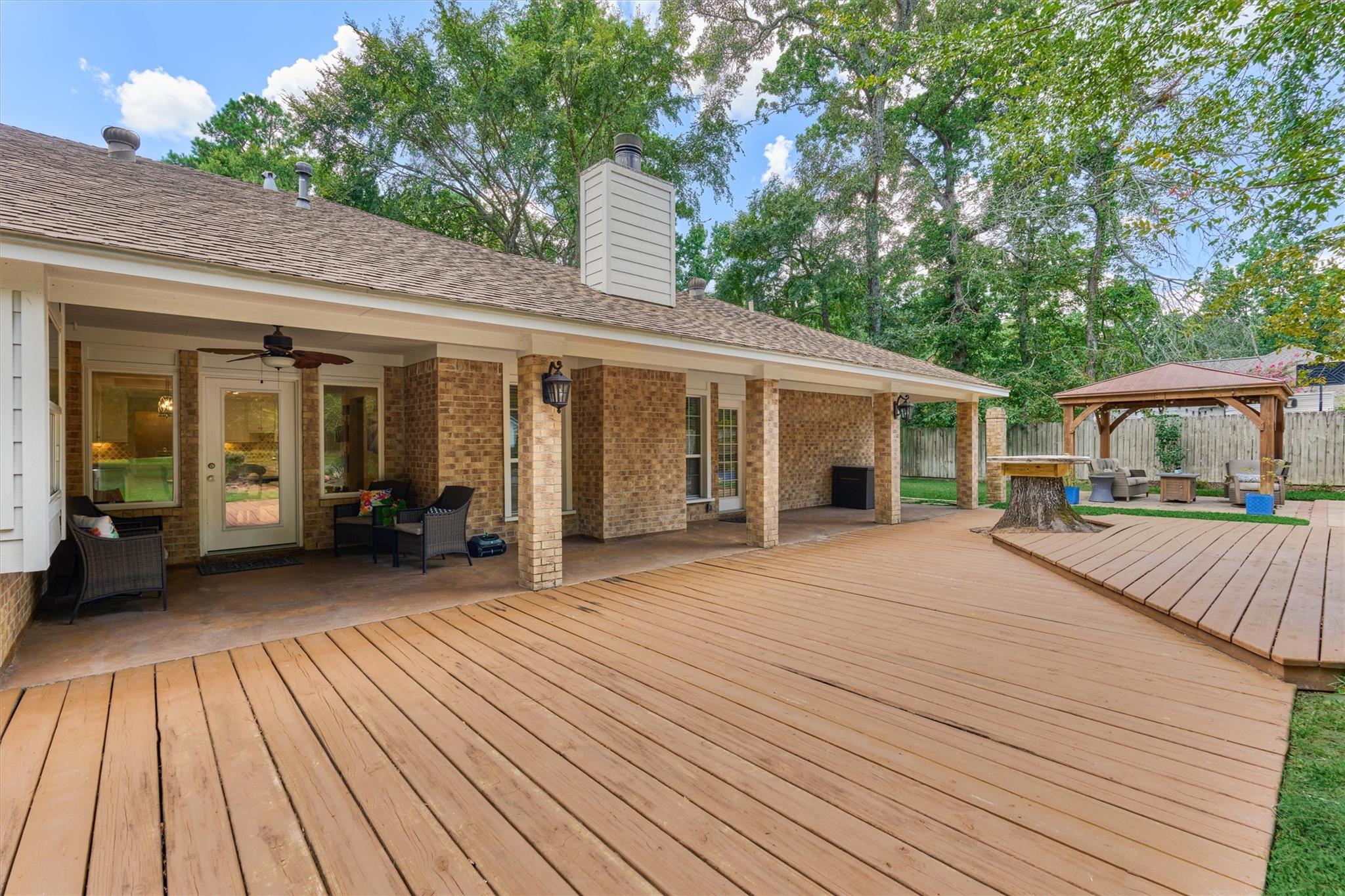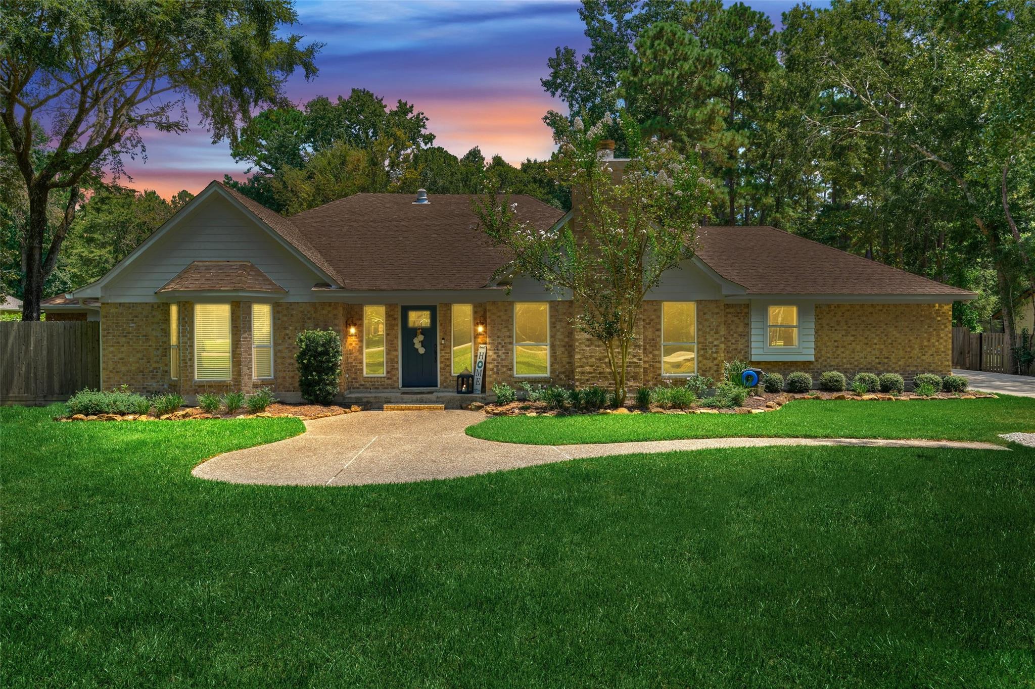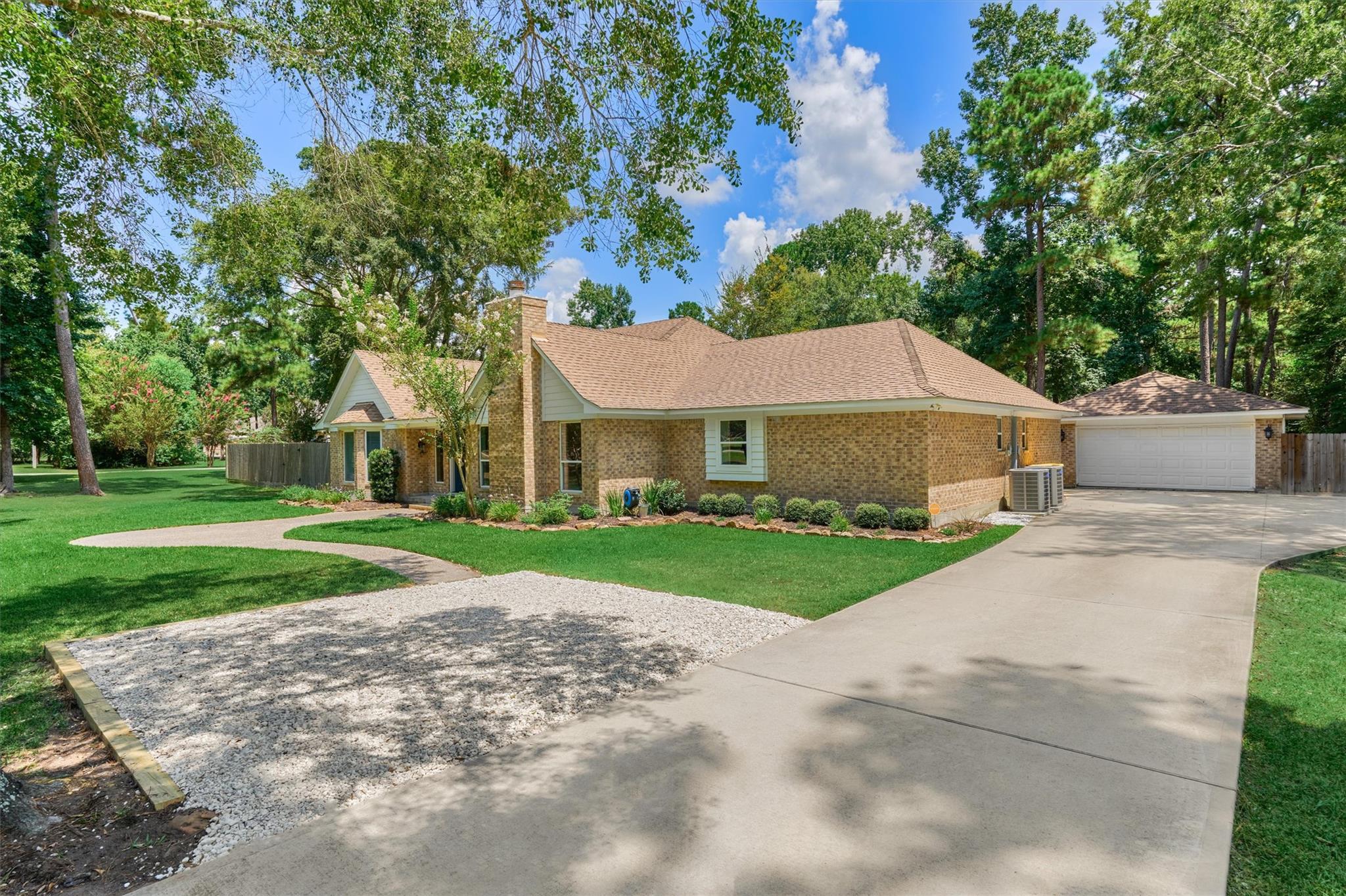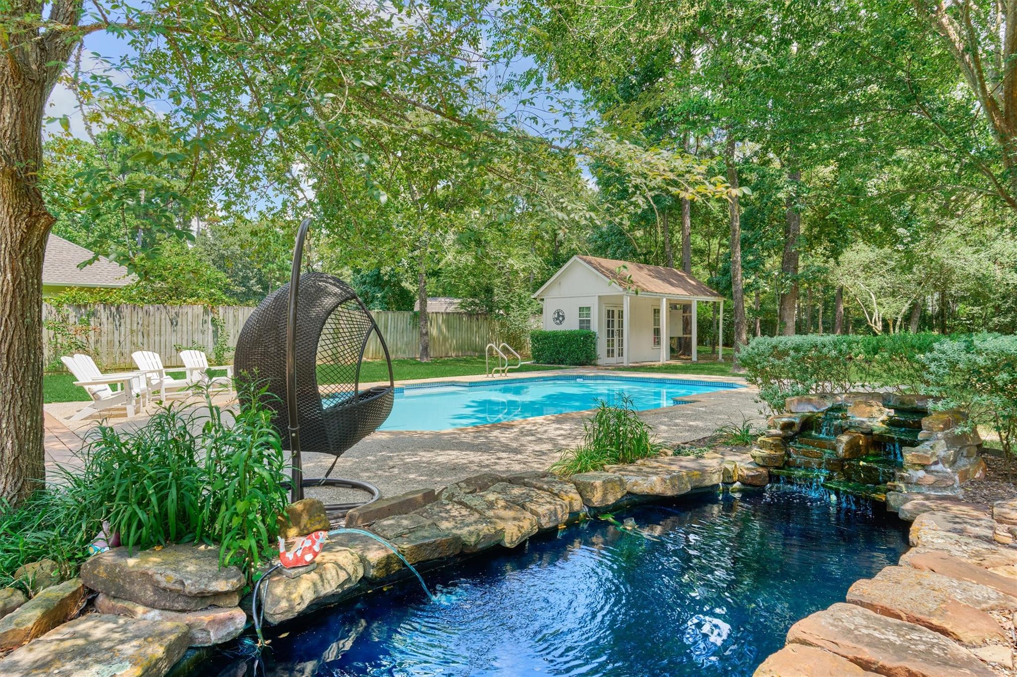 ELEGANT REMODEL ON 1.3 ACRE EXPANSE in sought-after Lake Creek Forest zoned to Bush Elem/TWHS! Updated inside & out, this 1-story gem ft. fresh paint thru out incl. cabinets! Dream kitchen offers marble backsplash, quartz counters, dual sinks, reverse osmosis, expanded cabinetry + w/in pantry. True hardwoods in main living areas + new carpet in BRs! Den showcases limestone fireplace w/reclaimed wood mantel + spacious dining room perfect for entertaining! Upgraded fixtures complement this stylish property! Family room w/French doors (opt. office) overlooks this wooded paradise! Split plan w/secluded primary BR w/fireplace & sitting area + updated bath w/impressive storage! 2 en-suite secondary bedrooms w/updated baths + 4th bedroom is opt. flex room! Craft room w/utility alcove + builtin desk & bonus cabinetry! Mudroom storage w/cubbies! Wooded oasis w/heated pool, gazebo, chicken coop, fruit trees, fire pit, koi pond & MORE! GENERATOR! RECENT ACs/Mechanicals! Easy to I-45/Woodlands!