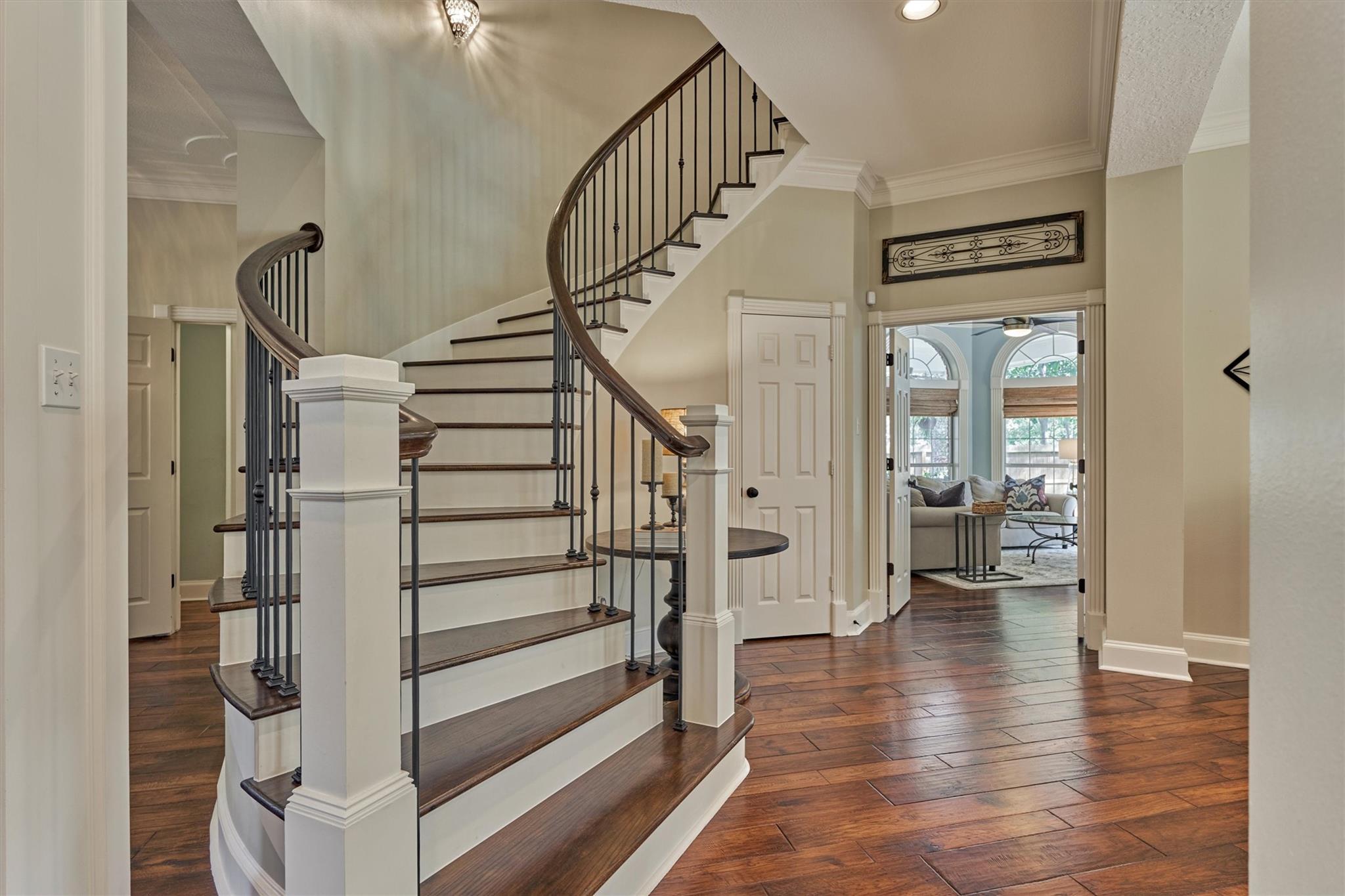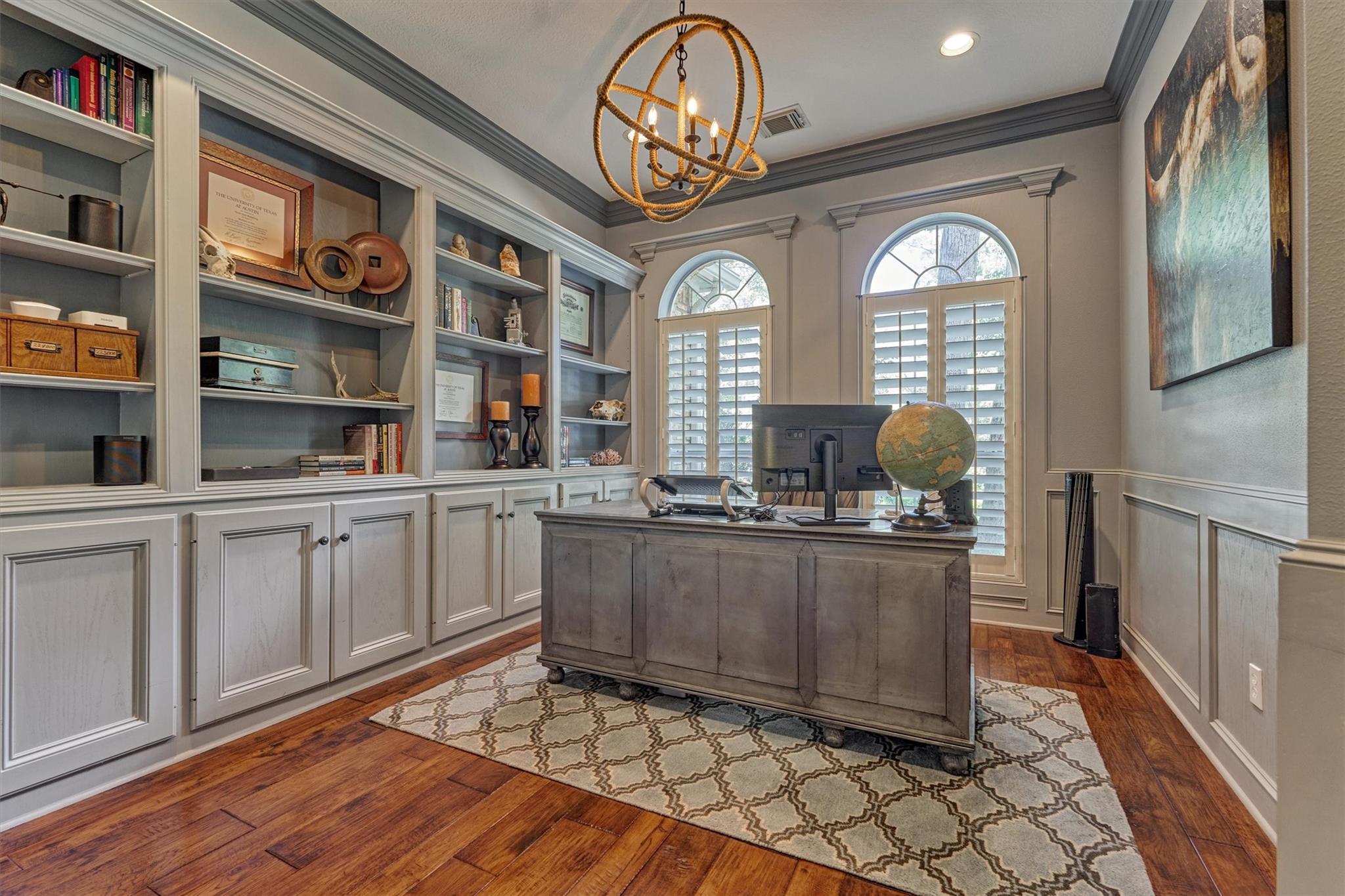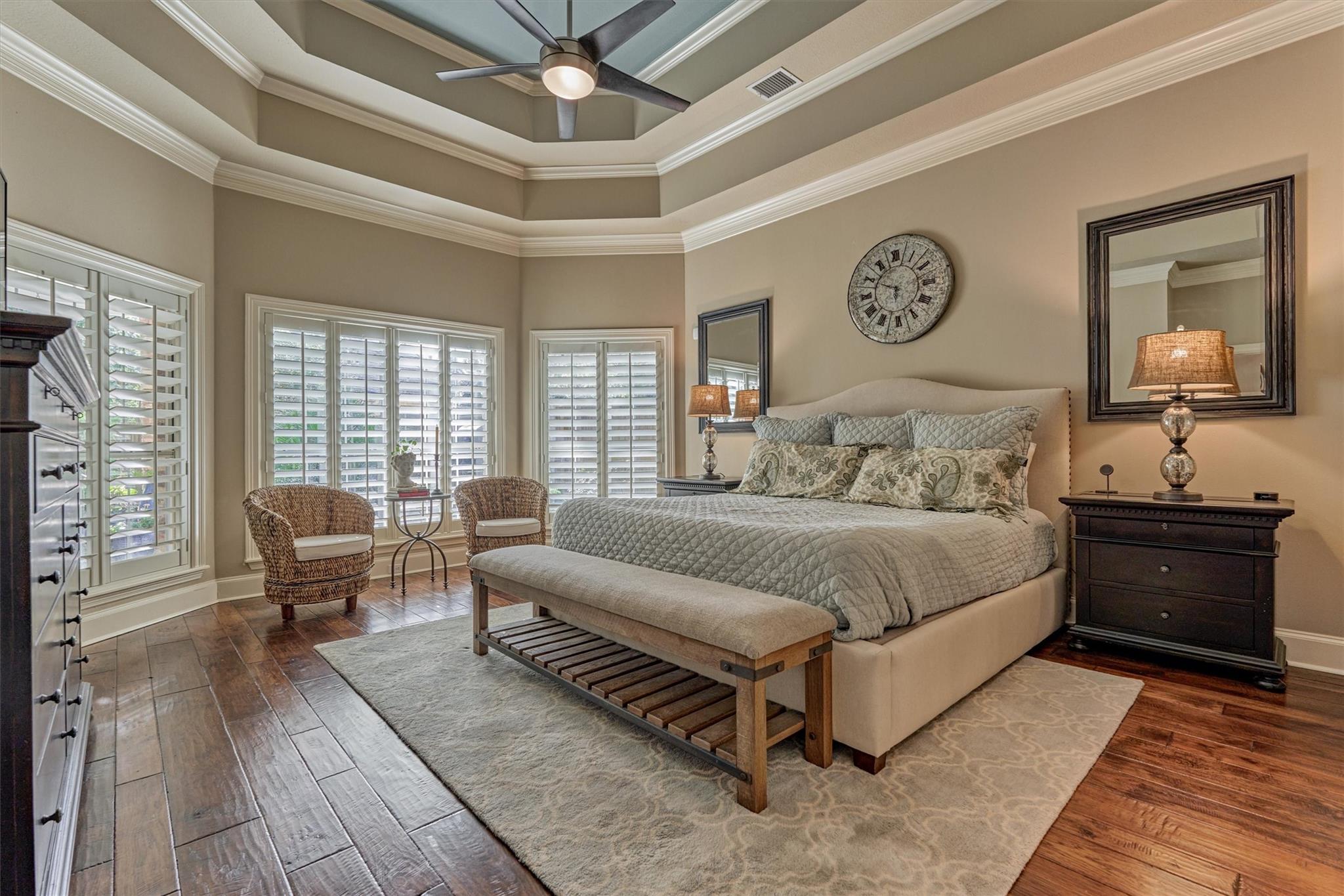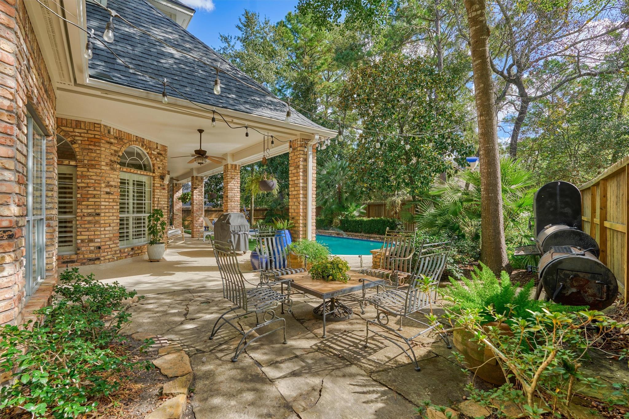 A QUINTESSENTIAL SOUTHERN CLASSIC - this 5 BR custom boasts a BRAND NEW roof & downstairs AC unit, designer updates throughout, a private backyard oasis w/sparkling Pebble Tec pool, fire pit, artificial turf for pets, covered patio/veranda, mature landscaping, and is situated in premier Palmer Woods neighborhood w/cascading golf course & serene water views for the ultimate drive-home experience! This pristine home has it all: continuous wood flooring, wood treads on stairs w/iron balusters, well-appointed chef's kitchen w/double ovens, custom cabinets, dry bar w/beverage fridge, gorgeous sight lines from den & living room to picturesque outdoor living area. Amazing built-ins & storage including 2 walk-in attics! Dedicated home office & secluded owner's retreat w/luxe bath featuring cast-iron tub, vanity & huge clst! Enclosed game room up + 4 spacious secondary BRs! 2-car garage w/workshop! 1/2 bath w/pool access! Mins to Palmer course & clubhouse, zoned to exemplary Galatas Elem/TWHS!